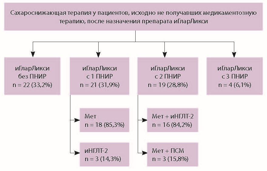 В группе больных, которые исходно не получали медикаментозную ССТ, иГларЛикси был назначен не только в качестве монотерапии, но и в комбинации с ПНИР. В 6,1% случаев (n = 4) к препарату иГларЛикси была добавлена тройная комбинация ПНИР (рис. 4).