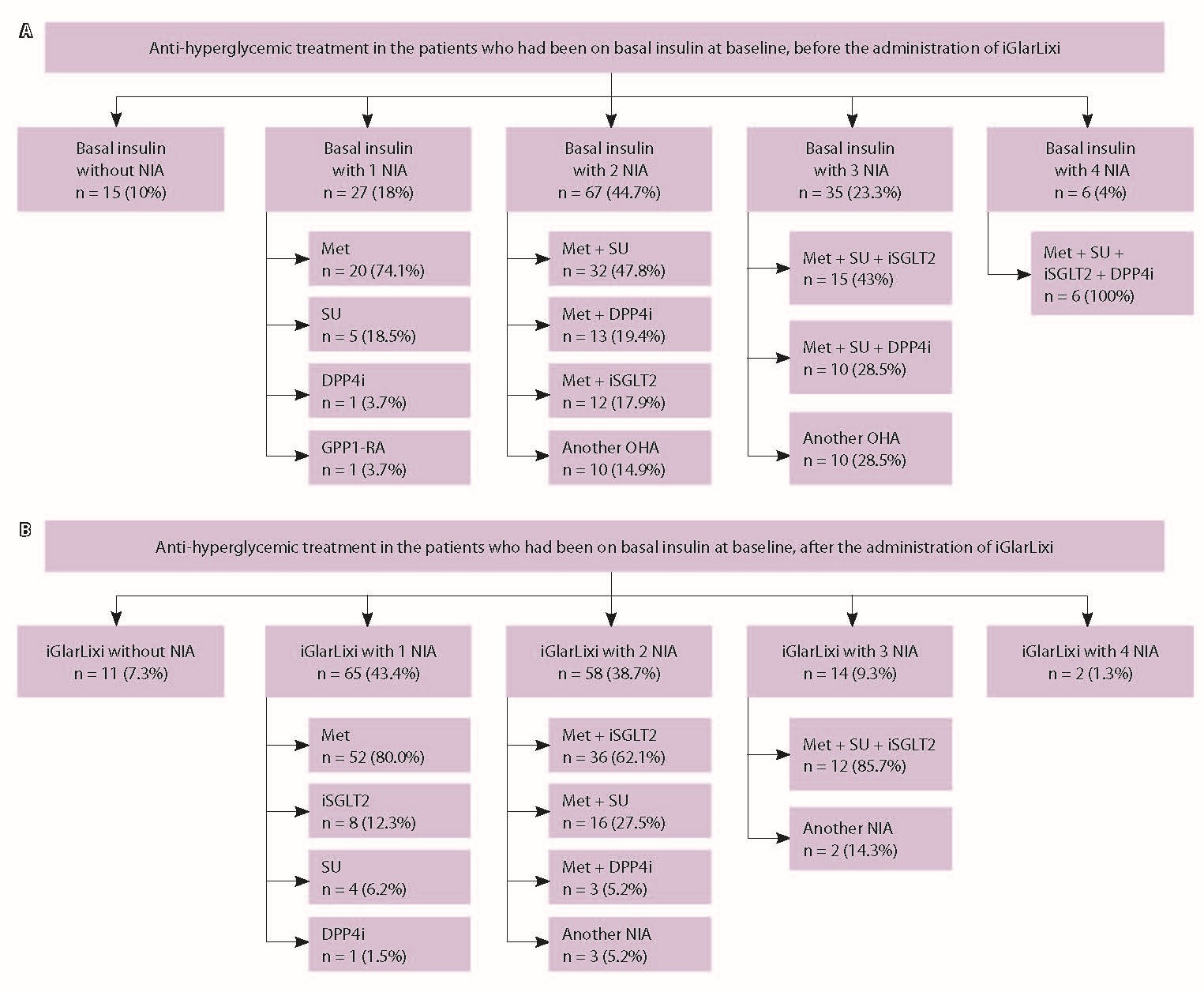 Conclusion: The study results confirm the possibility to use iGlarLixi for the initiation of insulin therapy and as an alternative to the intensification of insulin treatment. The addition of iGlarLixi to GLT regimens in the patients who had been treated with a basal insulin, promoted a decrease in HbA1c and BMI levels. In most cases, iGlarLixi was prescribed in the cases with insufficient glycemic control.