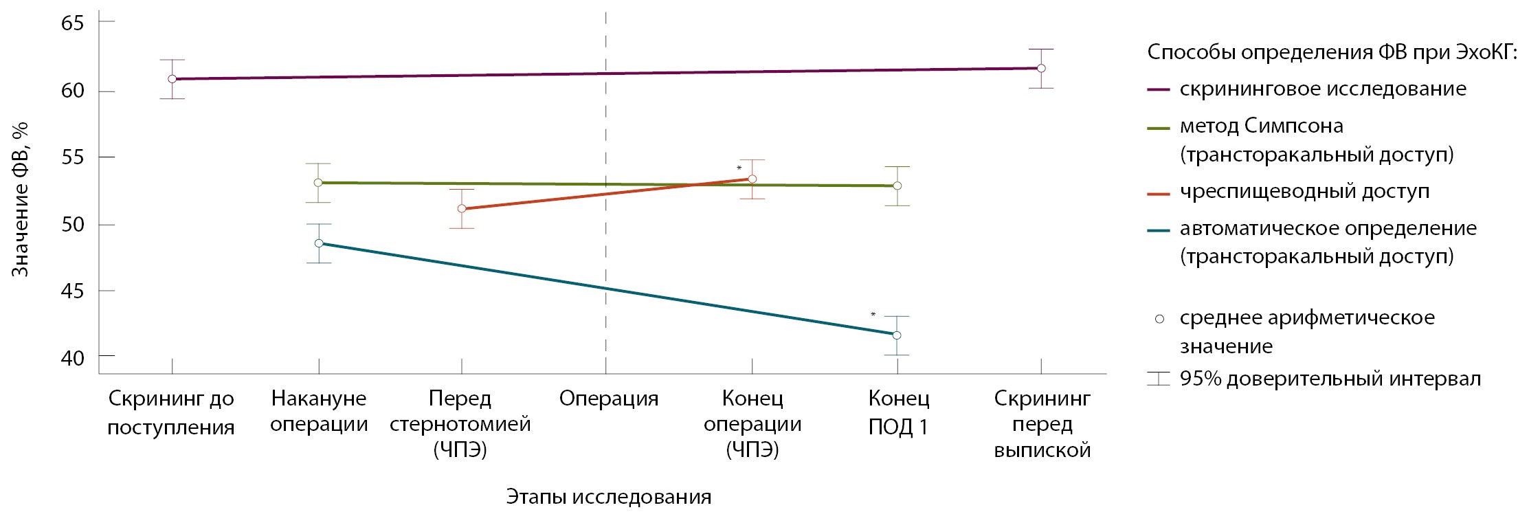 Рис. 1. Динамика фракции выброса (ФВ), определенной разными способами, на этапах исследования с соответствующими линиями интерполяции. ПОД 1 – первый послеоперационный день, ЧПЭ – чреспищеводная эхокардиография, ЭхоКГ – эхокардиография. * p < 0,05 в сравнении с предоперационным значением