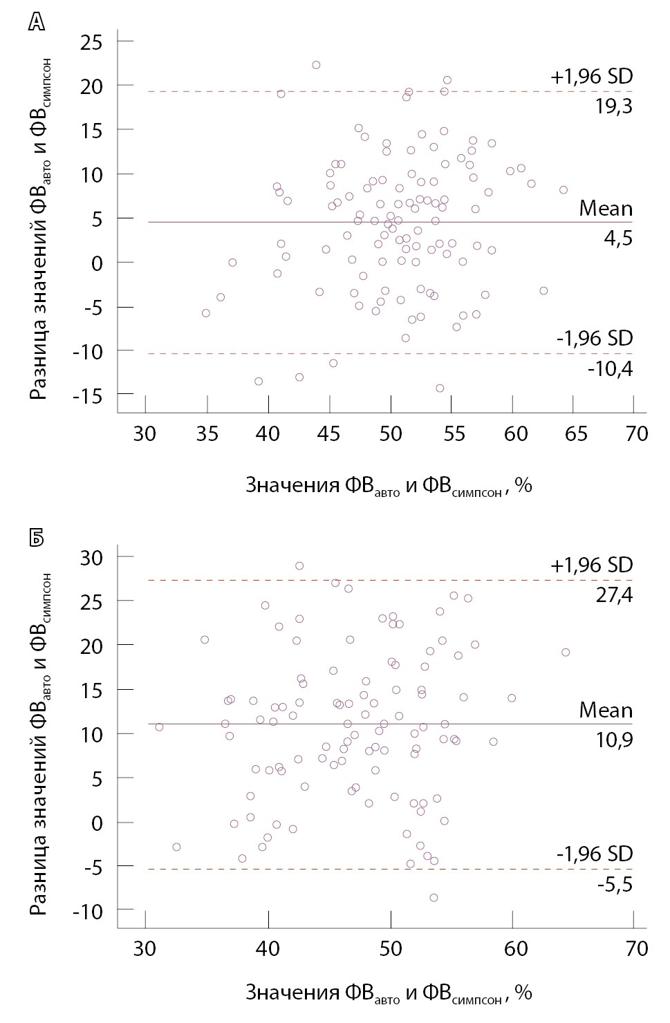 Рис. 2. Диаграммы Бланда – Альтмана для различий в показателях фракции выброса, измеренной автоматически (ФВавто) и опера-тором по методу Симпсона (ФВсимпсон) накануне операции (А) и в конце первых послеоперационных суток (Б). Mean – среднее арифметическое значение, SD – стандартное отклонение