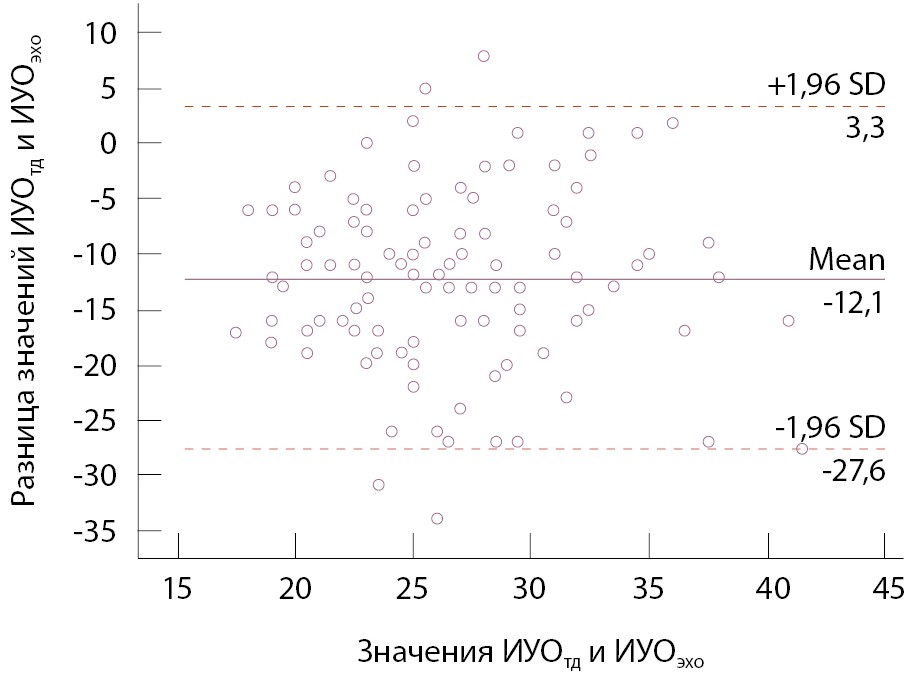Рис. 4. Диаграмма Бланда – Альтмана для различий в показателях индекса ударного объема, полученных при термодилюции (ИУОтд) и при эхокардиографии (ИУОэхо) в конце первых послеоперационных суток. Mean – среднее арифметическое значение, SD – стандартное отклонение