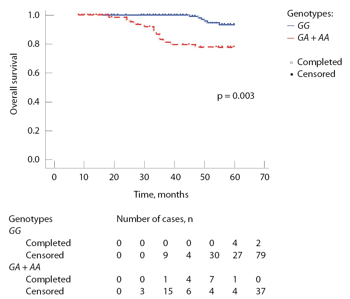 Сравнительный анализ ОВ показал статистически значимую наилучшую выживаемость у носителей генотипа GG в сравнении с генотипами GA + АА (р = 0,0003), медиана ОВ не была достигнута в обеих выборках пациенток с носительством генетических вариантов TNFα rs1800629. Пятилетняя ОВ пациенток с GG-генотипом составила 96,13%, а с генотипами GA + АА – 84,15%. Влияние минорного АА и гетерозиготного GA генотипов при РШМ и ВПЧ-позитивном статусе на снижение ОВ позволило установить негативное значение минорной аллели А как фактора риска развития РШМ и сокращения времени жизни при РШМ (рис. 1).