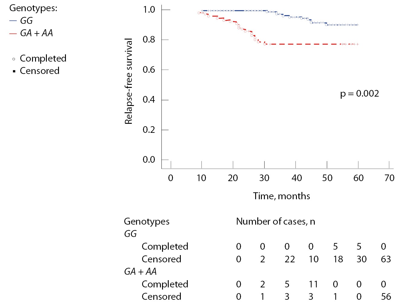 Рис. 2. Связь генотипов TNFα rs1800629 с безрецидивной выживаемостью у больных раком шейки матки с ВПЧ-позитивным статусом