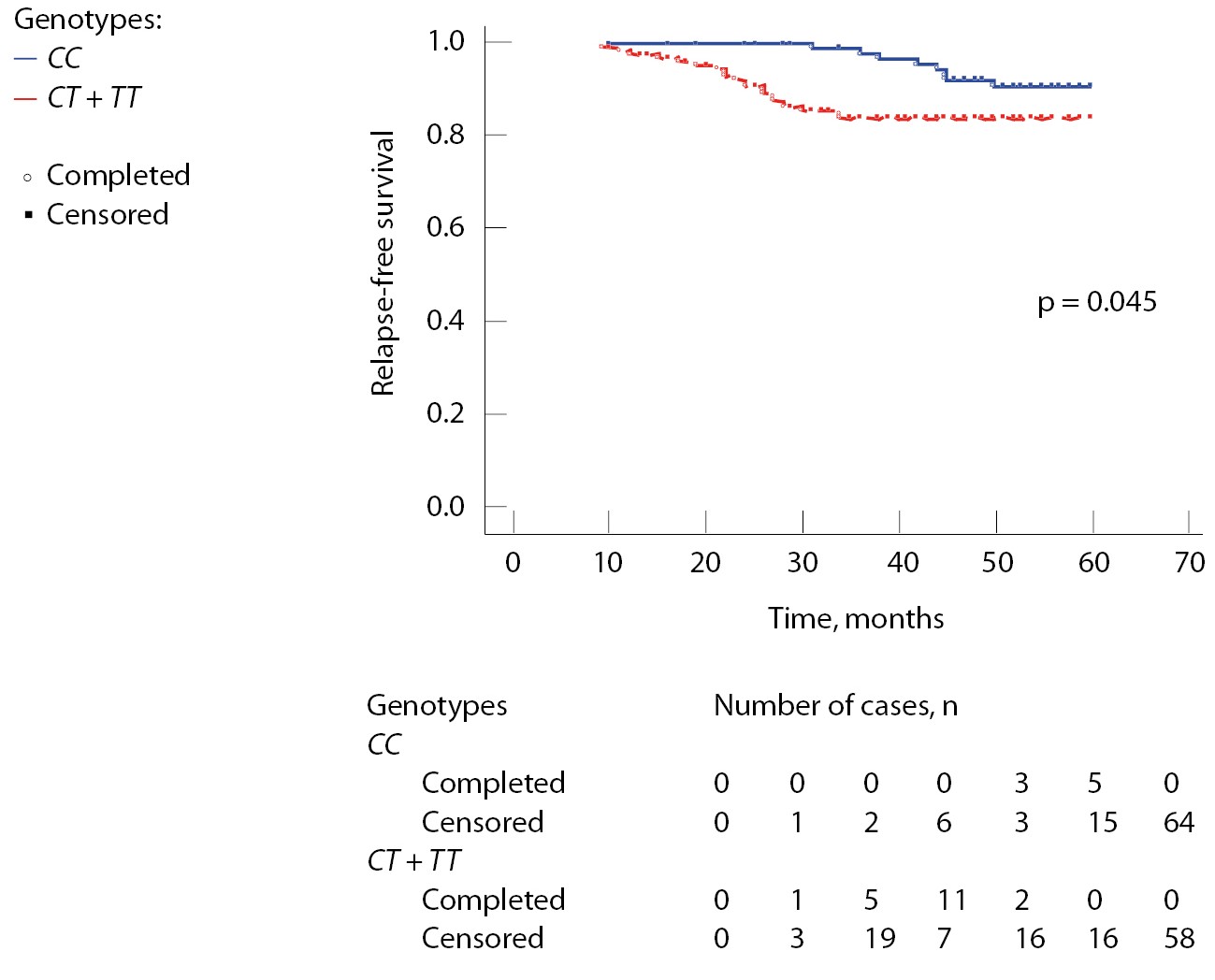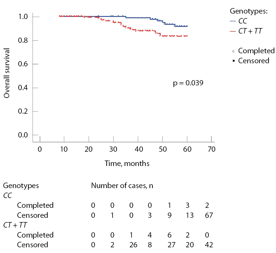 Статистическую обработку полученных результатов осуществляли в программе Statistica 8.0 (StatSoft, США). Генотипы и их комбинации были проанализированы с помощью критерия χ2 Пирсона и отношения шансов (OШ) с 95% доверительным интервалом (ДИ). Для определения связи генетических маркеров с безрецидивной выживаемостью (БРВ) и ОВ использовали метод Каплана – Мейера. Сравнительный анализ выживаемости проводили при помощи лог-рангового теста. Различия при значениях p < 0,05 считали статистически значимыми.