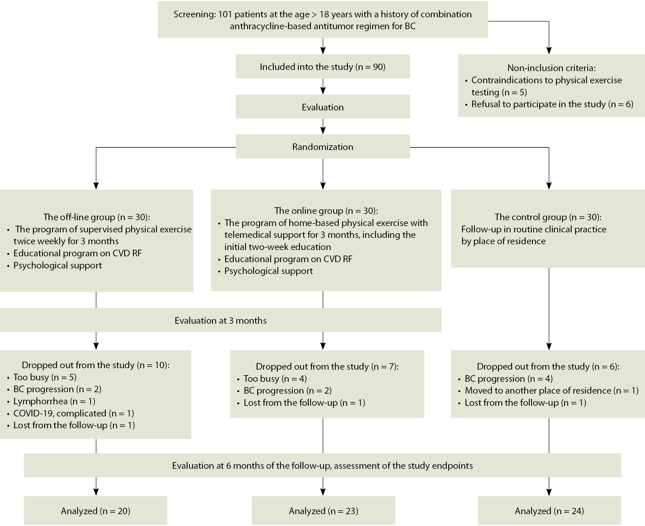 Проведено пилотное одноцентровое рандомизированное проспективное исследование. Обследовано 90 пациенток в возрасте 18 лет и старше, перенесших комплексное ПОЛ по поводу РМЖ, включавшее антрациклин-содержащую химиотерапию (ХТ), оперативное лечение в сочетании с лучевой, таргетной или гормональной терапией или без таковой согласно действующим рекомендациям. Пациентки были направлены или самостоятельно обратились в ФГБУ «Национальный медицинский исследовательский центр кардиологии имени академика Е.И. Чазова» Минздрава России (ФГБУ «НМИЦК им. ак. Е.И. Чазова» Минздрава России) в 2021–2023 гг. для обследования и определения тактики кардиологического ведения после завершения кардиотоксичного ПОЛ. Критериями невключения в исследование были абсолютные противопоказания к проведению нагрузочных проб. Проведение исследования одобрено независимым этическим комитетом ФГБУ «НМИЦК им. ак. Е.И. Чазова» Минздрава России (протокол № 269 от 28.06.2021). Все пациентки подписали добровольное информированное согласие на участие в исследовании.