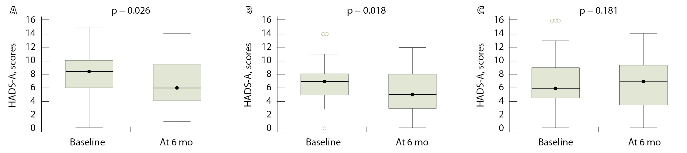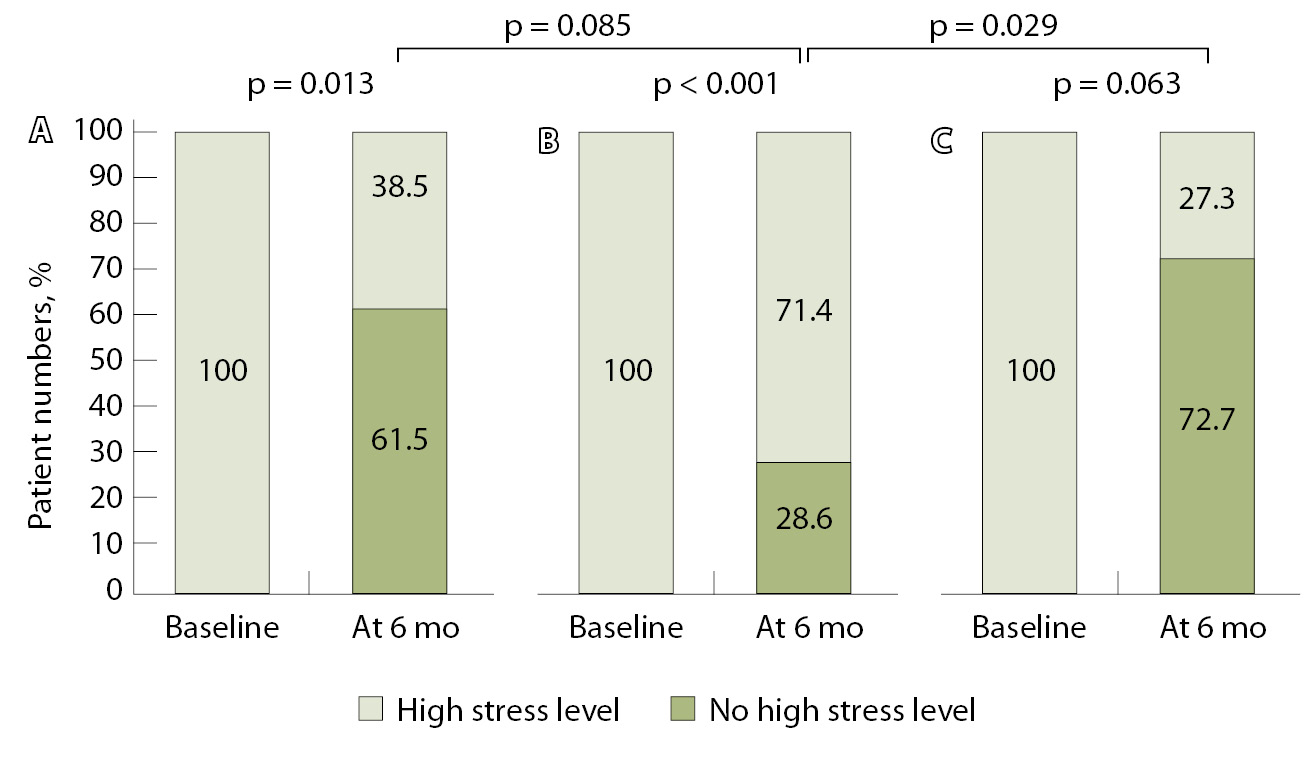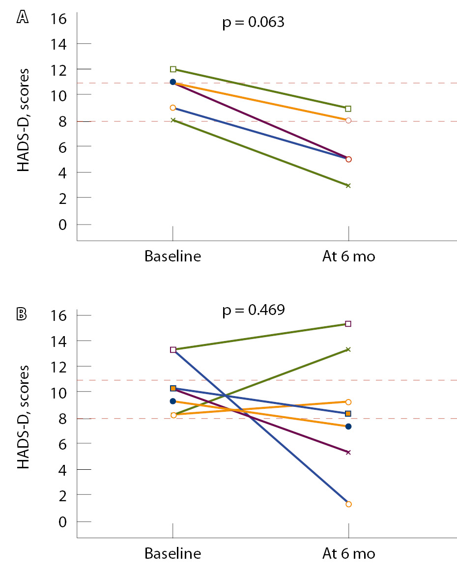 Results: The patients median age was 49 years [IQR 46; 56]. At baseline, anxiety symptoms (AS) were found in 45 (50%) patients, depressive symptoms (DS) in 16 (17.8%), high stress levels in 51 (56.7%), sleep disturbances in 80 (89%), and cognitive impairment in 11 (12.4%) patients. There were no differences at baseline between the groups in their main characteristics studied. Over the 6-month follow up, 23 patients dropped from the study. By the end of the observation period, the CORE groups showed a decrease in AS in the Off-L group (n = 20) from 8.5 [6.0; 10.0] to 6.0 [4.0; 9.5] points, with the difference in their median values of -1.5 (95% confidence interval [CI]: -3.0, -0.5, p = 0.026) and in the On-L group from 7.0 [5.0; 8.0] to 5.0 [3.0; 8.0] points (the difference in median values: -2.0, 95% CI: -3.0, 0.5, р = 0.018). No significant changes in AS were found in the control group (the difference in median values: -0.5, 95% CI: -2.0, 0.5, p = 0.181). In the patients with baseline subclinical (8 to 10 points, HADS-A) and clinically significant (≥ 11 points) anxiety, the participation in the CORE programs have led to a higher chance of its decrease either to < 8 points or a change in the anxiety category from clinically overt to subclinical (odds ratio 5.667, 95% CI: 1.129, 28.455, р = 0.035). By the end of the follow up, the stress levels in the Off-L group decreased from 8.0 [5.0; 9.0] to 7.0 [4.0; 8.0] VAS points (the difference of the medians: -1.5, 95% CI: -2.0, 0.0, р = 0.050), in the On-L group from 7.0 [6.0; 8.0] to 5.0 [4.0; 6.8] points (the difference of the medians: -1.5, 95% CI: -2.5, -0.5, р = 0.003). There were no significant changes over time in the stress levels in the control group (the difference of the medians: 0.0, 95% CI: -1.0, 1.0, р = 0.974). No statistically significant changes were found in depression scores or sleep quality over the 6-month observation period in the study groups. The On-L group demonstrated a statistically significant improvement in the MoCA cognitive function scores (the difference of the medians: 0.5, 95% CI: 0.0, 1.0, р = 0.021).