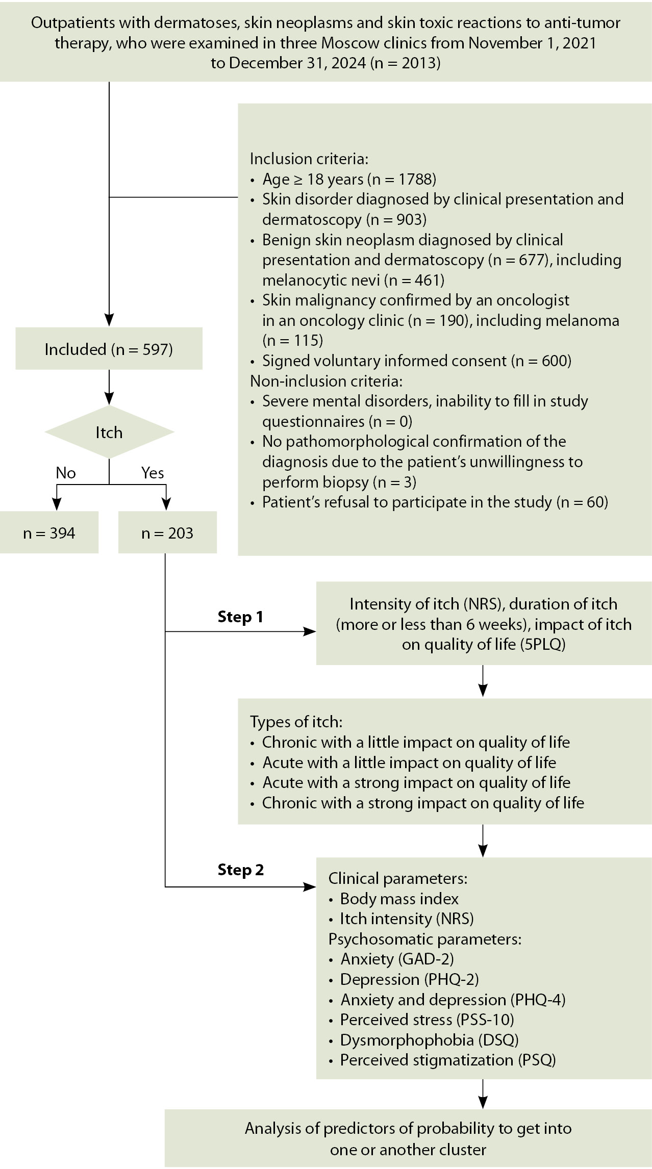 Для выявления естественного разбиения набора данных, описывающих зуд, обследованная выборка пациентов была разделена на предыдущем этапе [7] на кластеры, в соответствии с которыми были выделены четыре подгруппы зуда: хронический, слабо влияющий на качество жизни; острый, слабо влияющий на качество жизни; острый, сильно влияющий на качество жизни; хронический, сильно влияющий на качество жизни (этап 1, см. рис. 1). В настоящем исследовании (этап 2, см. рис. 1) проведена сравнительная характеристика пациентов с выделенными типами зуда по социодемографическим, соматическим (индекс массы тела) и психосоматическим параметрам (показатели уровня тревоги и депрессии по шкалам PHQ-4, PHQ-2, GAD-2; уровень стигматизации и дисморфофобии по шкалам PSQ и DCQ; доля пациентов с выявленными по шкалам тревогой, депрессией, дисморфофобией; уровень воспринимаемого стресса по шкале PSS-10). Далее оценены предикторы попадания в тот или иной кластер зуда.