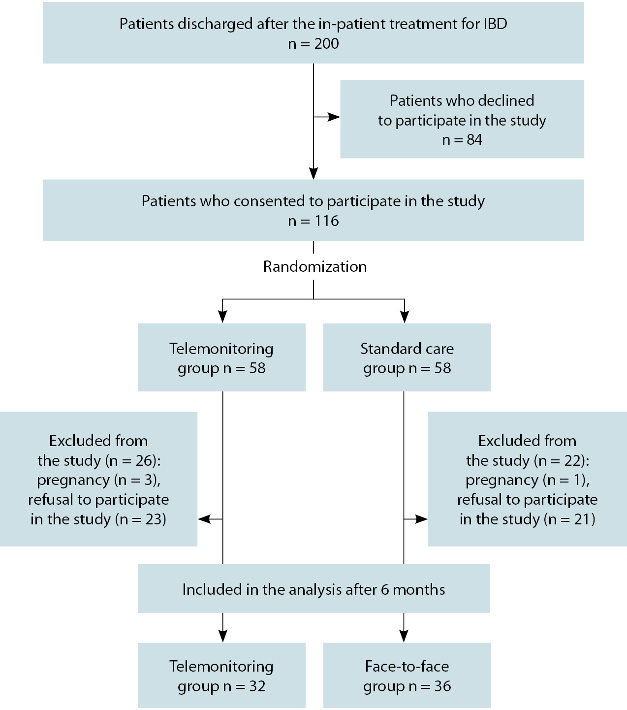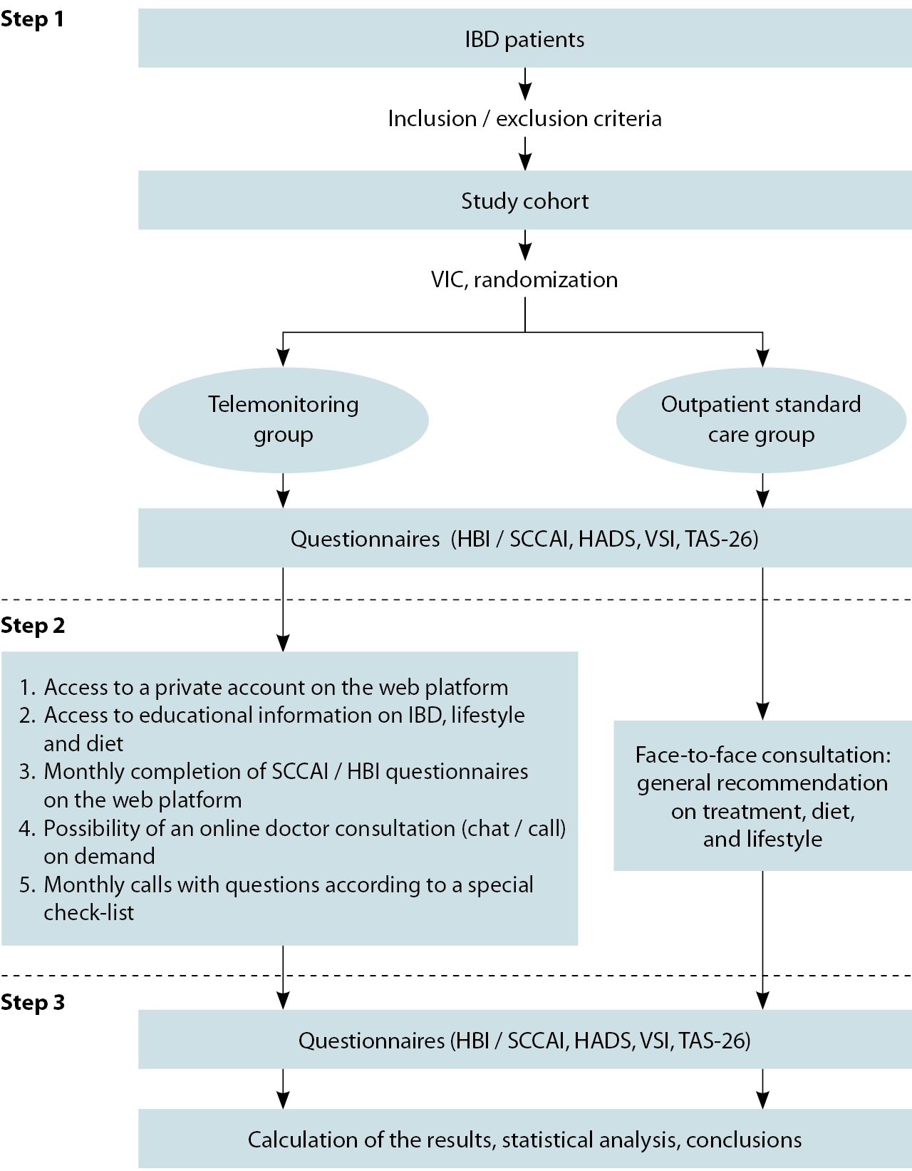 Methods: This was an interventional prospective randomized controlled study. The study patients were consecutively enrolled from April 2023 to April 2024 in the Department of Gastroenterology, University Clinical Hospital No. 1 (Sechenov University). The patients meeting the inclusion criteria (age over 18 years, with confirmed diagnosis of IBD, having signed a written informed consent to participate in the study) were randomized in a 1:1 ratio to either telemonitoring or standard care groups. At baseline and after 6 months of the follow-up they were assessed for the disease activity parameters (Simple Clinical Colitis Activity Index / Harvey Bradshaw Index, SCCAI / HBI questionnaire), depression and anxiety (Hospital Anxiety and Depression Scale, HADS), alexithymia (26-item Toronto Alexithymia Scale-26, TAS-26), and visceral sensitivity (Visceral Sensitivity Index, VSI) levels. The telemedicine intervention was done through a custom web platform with monthly audio check-ups to track the patients’ condition. The analysis of the questionnaires was based solely on the data from the available patients, and no missing data was imputed.