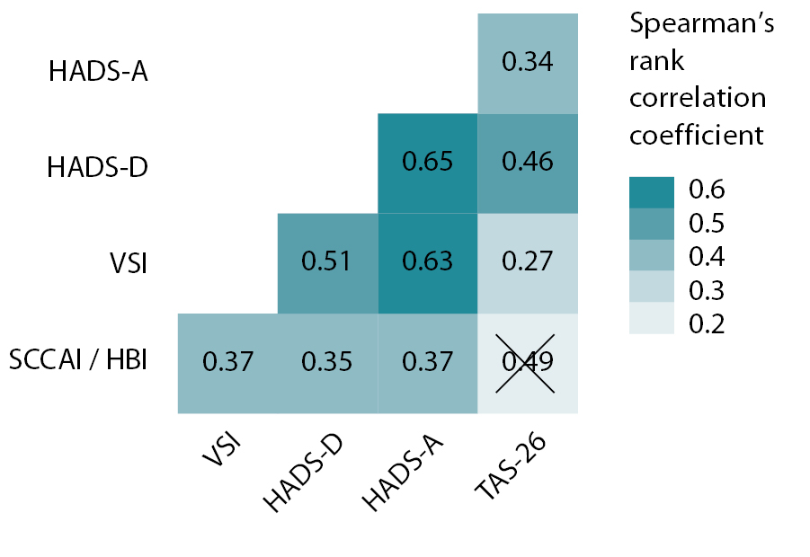 Рис. 3. Корреляционная матрица показателей психологического состояния пациентов на момент включения в исследование (n = 68). Символом (Х) обозначена корреляция ниже уровня статистической значимости (p < 0,05). HADS (Hospital Anxiety and Depression Scale) – Госпитальная шкала тревоги и депрессии, HBI (Harvey-Bradshaw Index) – индекс Харви – Брэдшоу, SCCAI (Simple Clinical Colitis Activity Index) – простой индекс активности язвенного колита, TAS-26 (26-item Toronto Alexithymia Scale) – Торонтская шкала алекситимии, VSI (Visceral Sensitivity Index) – индекс висцеральной чувствительности