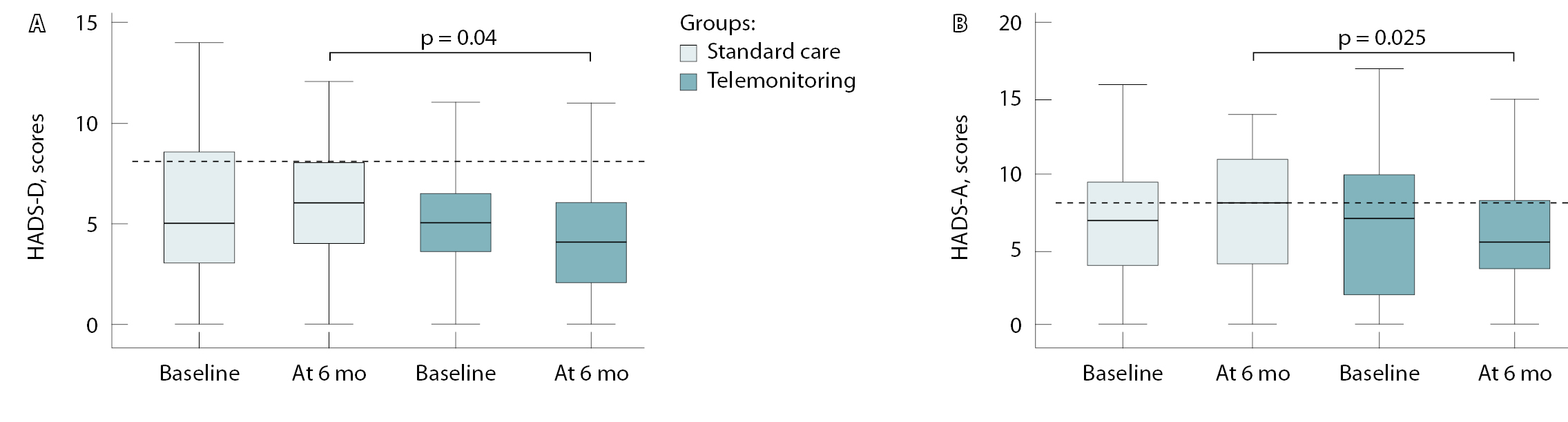 Рис. 4. Показатели депрессии (А) и тревоги (Б) опросника HADS в группах очного наблюдения и телемониторинга в момент включения в исследование (исходно) и через 6 месяцев наблюдения. Пунктирной линией указано пороговое значение для наличия тревоги и депрессии. HADS (Hospital Anxiety and Depression Scale) – Госпитальная шкала тревоги и депрессии, А – домен тревоги, D – домен депрессии