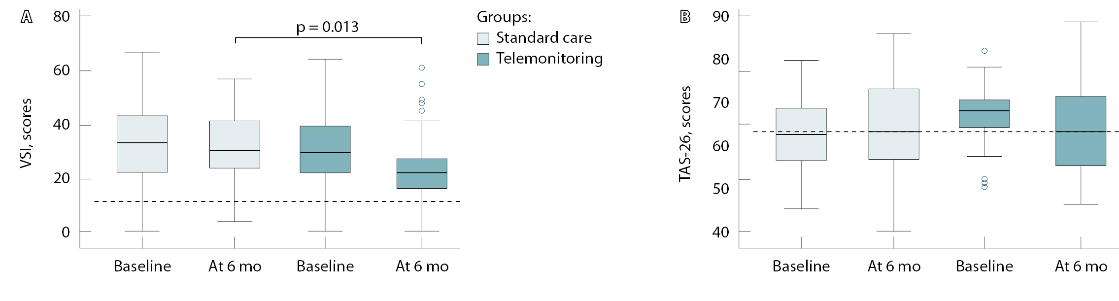 Рис. 5. Показатели индекса висцеральной чувствительности (А) и алекситимии (Б) в группах очного наблюдения и телемониторинга в момент включения в исследование (исходно) и через 6 месяцев наблюдения. Пунктирной линией указано пороговое значение для наличия висцеральной гиперчувствительности и алекситимии. TAS-26 (26-item Toronto Alexithymia Scale) – Торонтская шкала алекситимии, VSI (Visceral Sensitivity Index) – индекс висцеральной чувствительности