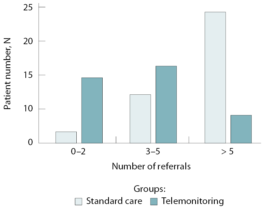 Рис. 6. Сравнение частоты обращений пациентов на амбулаторные консультации между группами очного наблюдения и телемониторинга