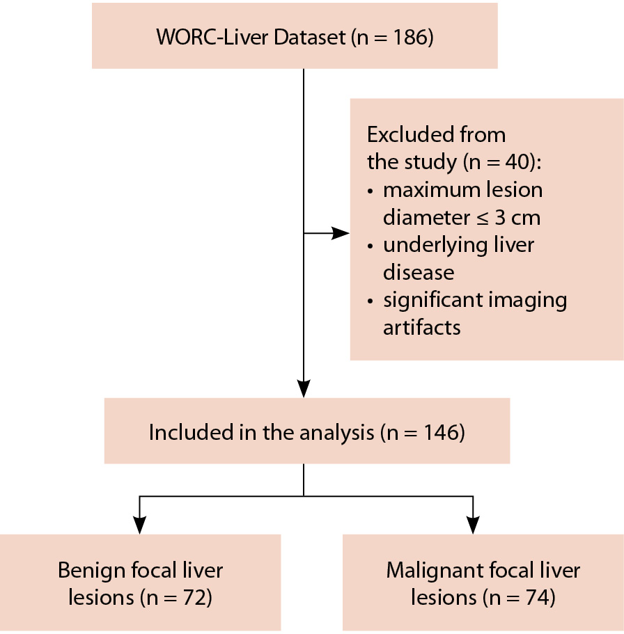 В исследование не было включено 40 случаев: с максимальным диаметром образования ≤ 3 см, фоновым заболеванием печени, значительными артефактами при визуализации. Из оставшихся 146 случаев 72 были злокачественными и 74 – доброкачественными очаговыми образованиями (рис. 2). Разделение выборки составляло 80:20 для обучающей и внутренней валидационной выборок соответственно.