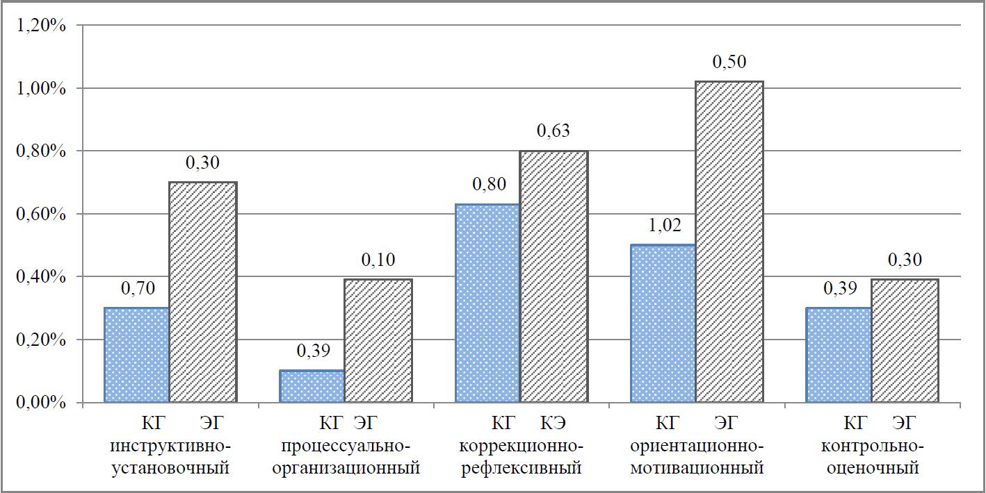 Эффективность реализации модели [6] формирования готовности студентов к самостоятельной работе средствами инновационных технологий подтверждена результатами, полученными в процессе проведения экспериментальной работы. К концу эксперимента количество студентов, находящихся на низком уровне, сократилось на 48,0 %, на оптимальный уровень поднялись – 51 % респондентов, что составляет разницу с результатами констатирующего этапа 42 %. В КГ произошли менее заметные изменения. Математическая обработка результатов эксперимента (по методике Р. Б. Кеттелла) показала, что уровни сформированности готовности студентов к самостоятельной работе в КГ и ЭГ существенно отличаются (рис. 1).