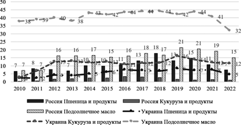 Так, доля Украины в мировом экспорте подсолнечного масла в отдельные периоды достигала 44%, доля России – 21%, но уже по итогу 2022 г. доля Украины снизилась до 32%, России – до 15% (см. рис. 2). В мировом экспорте кукурузы доля Украины достигала 16% (2019 г.). Для обеспечения глобальной продовольственной безопасности гораздо более важное значение имеет торговля пшеницей, где Россия является крупнейшим экспортером в мире, а ее доля в отдельные периоды достигала 18% от мирового экспорта (2018 г.).