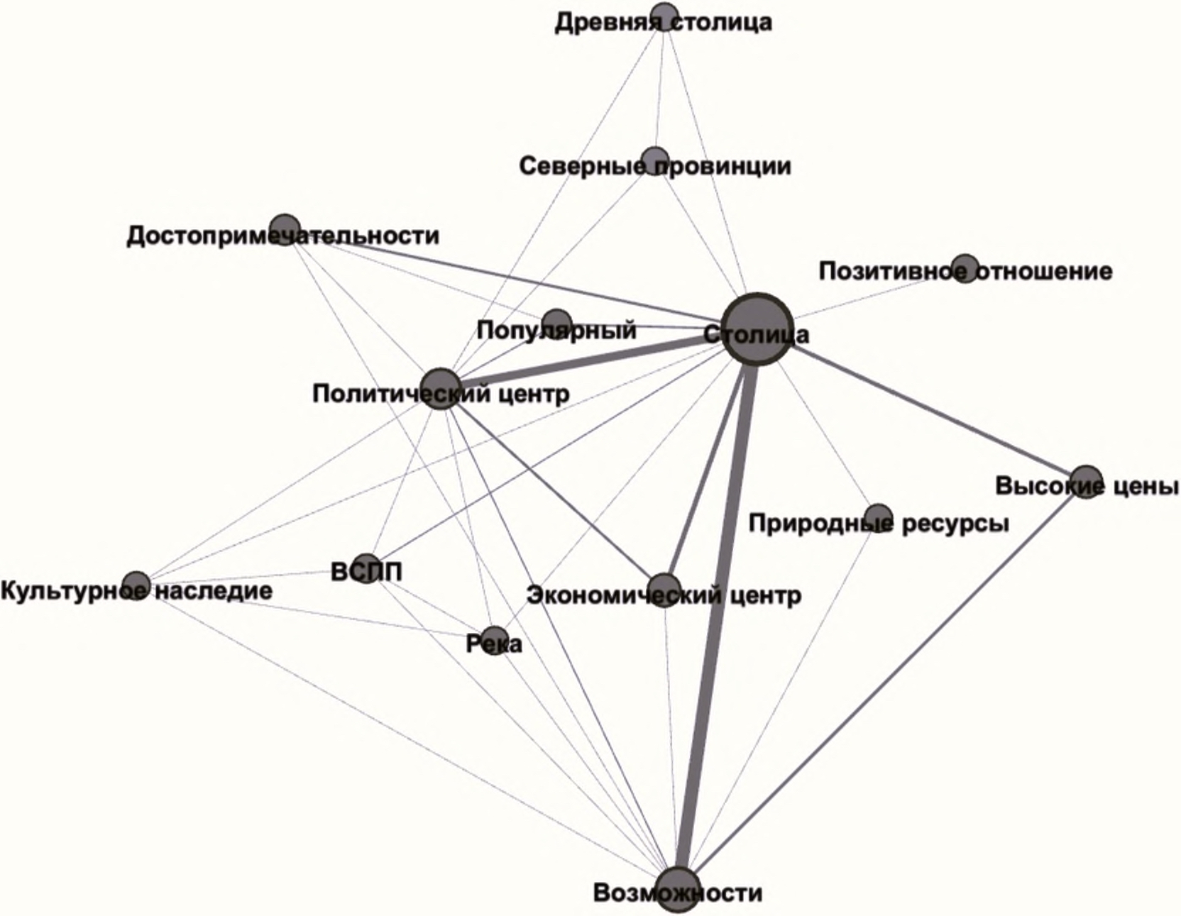 Граф включает в себя два кластера (обозначены разными цветами), меньший из них является периферийным, состоит из двух полей: «Древняя столица» и «Северные провинции». Поле «Древняя столица» располагается в отдельном кластере – в реакциях информантов указание на историю города редко сопровождается описанием современных реалий и достижений, скорее, указывается неизменность китайской истории: 北京从明朝开始就是中国的首都 [Пекин был столицей Китая со времен династии Мин].