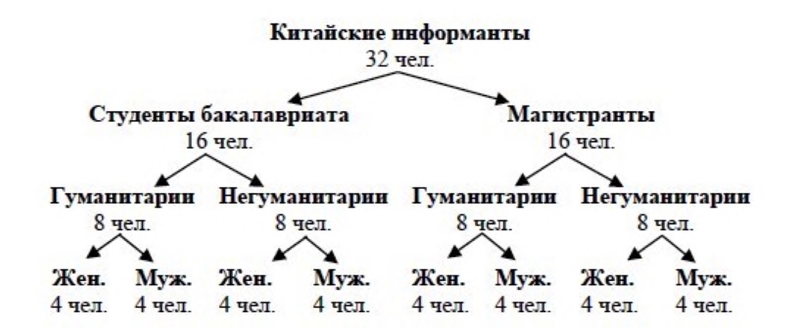 Материалом исследования являются семантические компоненты, полученные от 32 китайских информантов. Выборка информантов сбалансирована по трем стратам: уровень образования (студент бакалавриат/магистрант), специальность (гуманитарный профиль / негуманитарный профиль) и гендер (женщина/мужчина). Страта понимается как «конституирующий признак биологических, социальных и психологических свойств, характерных для определенной общности (группы)» [Ерофеева Т. И. 2009: 34]. Другими словами, страта – не только слой людей, но и признак, по которому проводится стратификация. Такая выборка дает возможность исследовать лексему ВЕЖЛИВОСТЬ в групповом сознании китайских студентов (рис. 1).