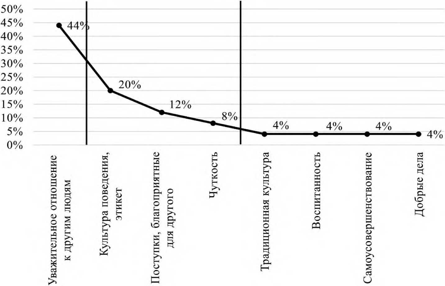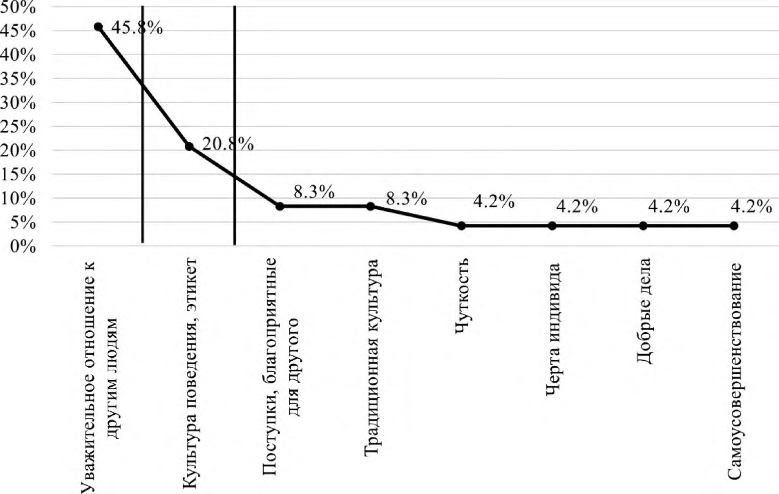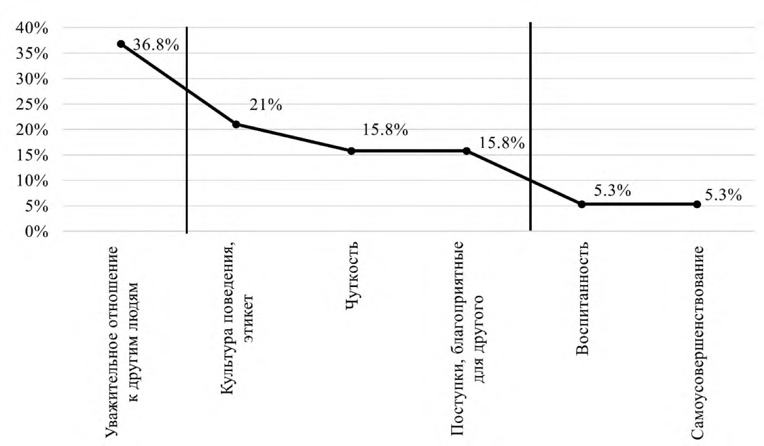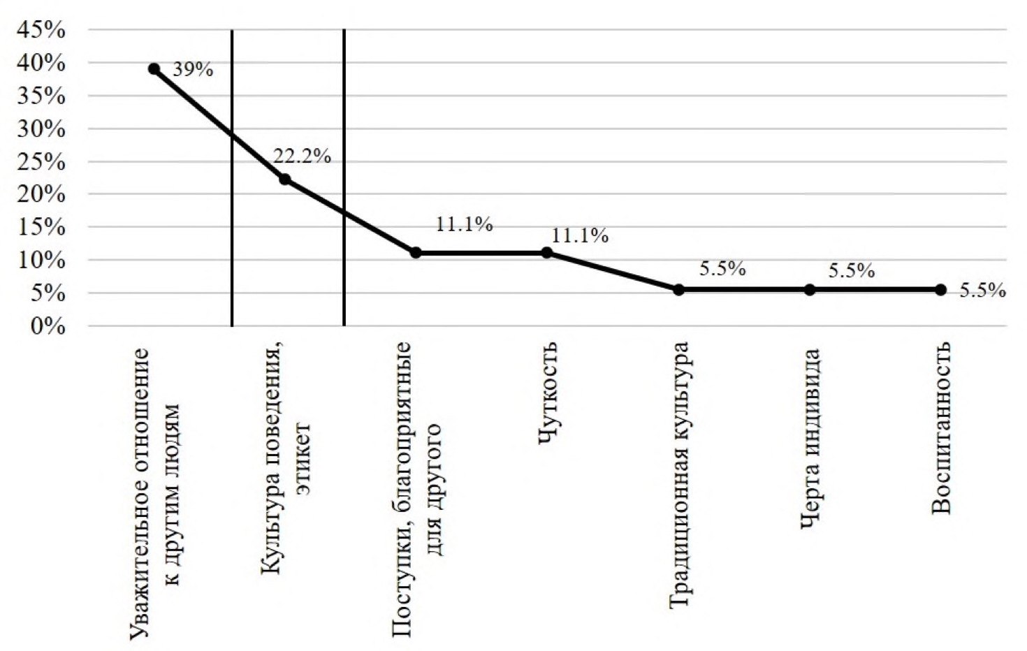 В ответах магистрантов выделено уже 8 семантических компонентов: 1) уважительное отношение к людям; 2) культура поведения, этикет; 3) поступки, благоприятные для другого; 4) чуткость; 5) традиционная культура; 6) добрые дела; 7) воспитанность; 8) самоусовершенствование.