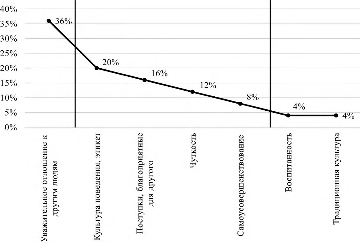 Ядерная зона представлена одним и самым частотным семантическим компонентом для группы магистрантов – уважительное отношение к другим людям. Предъядерная зона включает три семантических компонента: культура поведения, этикет; поступки, благоприятные для другого; чуткость. Периферийную зону составляют четыре компонента: традиционная культура; воспитанность; самоусовершенствование; добрые дела.