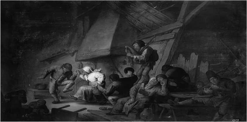 Семейство Зуровых, проезжая мимо одного заведения с вывеской «Здесь приуготовляют кушанье и чай», принимают его за кондитерскую, однако обнаруживают, что это «…заведение под заманчивой вывеской была харчевня» (Т. 1: 60). Гончаров словесно живописует бытовую сцену, в которой «дородный плешивый мужичок в красной рубашке отпер двери и остановился от изумления, встретив посетителей необыкновенного калибра» (там же). Повествователь замечает, что данная «картина» заслуживает достаточно подробного описания, а не «…одного беглого взгляда» (там же) и признается в том, что ранее ему не доводилось «посещать подобные заведения» (там же). В изображенной Гончаровым сцене, как и на полотне Остаде, нет яркого солнечного света, достаточного освещения, по той причине, что харчевни «…располагаются большею частию в нижних этажах, даже подвалах, и не представляют никакой преграды любопытному взору. Если вы взглядывали с улицы прямо в дверь, то верно видели в глубине комнаты огромный стол, уставленный штофиками, карафинчиками, тарелками с разной закуской, и за этим столом бородатого Ганимеда; если в воскресный день смотрели в окно, то верно замечали пирующих друзей, лица которых пылали, как освещенные переносным газом; а хохот, песни и орган уведомляли вас, что вы недалеко от храма утех» (там же). Схожую тематику можно обнаружить на картине «Харчевня», сюжет которой связан с мотивами эпикуреизма. В центральной части композиции находится возвышающаяся над пирующими фигура волынщика, который стоит на какой-то возвышенности (скорее всего на столе, который закрывает фигура мужчины, изображенного со спины и держащего в руке кувшин с напитком). Справа от него еще одна фигура, повернутая к зрителю спиной, – сидящий в расслабленной позе мужчина за трапезой. Слева от него пьющий мужчина с падшей женщиной, которая фривольно держит его за подбородок. В левой части картины, наиболее освещенной, расположена пара танцующих по аккомпанемент музыкального инструмента. На самом нижнем уровне картины, слева, практически в тени находится женщина с изумленным лицом и музыкант. Такой жанр бодегона (низкий жанр в иерархии живописи) позволял художникам сочетать в рамках одной картины темные, скудно освещенные интерьеры с элементами яркого акцентного натюрморта.