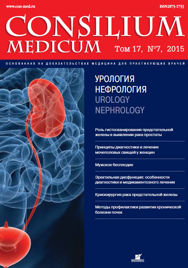 Актуальность. Хроническая болезнь почек (ХБП) - прогрессирующее заболевание, распространенность которого сопоставима с сахарным диабетом (СД), гипертонической болезнью (ГБ) и ожирением, приводящее к тяжелым осложнениям, высокой инвалидности и смертности больных. Эпидемиологические исследования по выявлению факторов риска развития ХБП изменяют традиционные представления об относительно низкой частоте заболеваний почек. Выявление факторов риска развития ХБП и исследование микроальбуминурии (МАУ) являются доступными методами профилактики, позволяющими своевременно корректировать образ жизни, физическую нагрузку, назначить лечебную диету, нефропротективную терапию, замедляющую прогрессирование хронических заболеваний почек, снизить риск развития тяжелых осложнений и затраты на лечение. Цель. Изучить распространенность факторов риска развития ХБП и выраженность МАУ среди пациентов консультативного диабетологического центра г. Иваново. Материал и методы. Для определения распространенности факторов риска ХБП и выраженности МАУ у 52 женщин и 10 мужчин 58-85 лет, средний возраст 68,3±5,3 года, обратившихся за медицинской помощью в консультативный диабетологический центр, проводилось исследование МАУ и анкетирование с использованием анкет, созданных по инициативе Научного общества нефрологов России в 2011 г. Для определения факторов риска развития ХБП проведен анализ анкет. МАУ исследовали с помощью тест-полосок «Микроальбуфан» (производитель Lachema) и диагностировали по уровню экскреции белка с мочой в количестве от 30 до 300 мг/сут, а также по соотношению альбумин/креатинин мочи. О наличии МАУ свидетельствует соотношение альбумин/креатинин мочи у мужчин - 2,5-25,0 мг/ммоль, у женщин - 3,5-25,0 мг/ммоль. Проведена интерпретация результатов исследования МАУ. Основные результаты. У большинства пациентов, обследованных в консультативном диабетологическом центре, выявлены основные факторы риска развития ХБП. У 82% пациентов группы наблюдения диагностировано ожирение 1-й степени. Более 1/2 обследованных пациентов имеют артериальную гипертензию (АГ) I-II стадии. Треть больных страдают СД типа 2, еще у 14% пациентов при наличии гипергликемии СД в настоящее время требует уточнения. Следует отметить, что у абсолютного большинства пациентов выявлена отягощенная наследственность по ГБ и другим сердечно-сосудистым заболеваниям. По результатам анализа анкет, созданных по инициативе Научного общества нефрологов России, выявлены изменения со стороны почек менее чем у 20% обследованных, но жалобы на возможное нарушение функции почек (отеки, боли в поясничной области, учащенное мочеиспускание) имели более 1/3 больных, что, несомненно, требует дальнейшего углубленного обследования с последующим проведением патогенетической терапии. По результатам исследования МАУ у пациентов, обратившихся в консультативный диабетологический центр, распространенность МАУ у пациентов с разными факторами риска ХБП была неоднозначной. Наибольшая выраженность и частота МАУ (90%) отмечались при сочетании нескольких наиболее важных факторов риска ХБП - СД типа 2, ожирение и АГ (p<0,05). У больных СД 2 типа с АГ в сравнении с пациентами с СД типа 2 без АГ в 2 раза выше абсолютные значения МАУ (102,1±36,1 и 53,7±23,8 мг/г соответственно; p<0,05) и соотношение альбумин/креатинин мочи (11,6±4,1 и 6,1±2