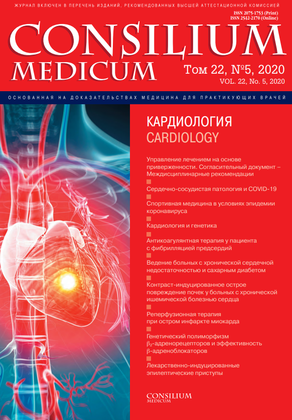 Aim. The aim of our study was to assess the 5-year prognostic significance of contrast-induced acute kidney injury (CI-AKI) in patients with chronic coronary artery disease (CAD). Materials and methods. 561 patients with stable CAD and indications for procedures with intraarterial contrast media administration were included in prospective open cohort study (ClinicalTrials.gov ID NCT04014153). CI-AKI was defined as the 25% rise (or 0.5 mg/dl) of serum creatinine from baseline assessed 48 hours after administration of contrast media. The primary endpoint was CI-AKI according to KDIGO criteria. The secondary endpoints were total mortality, cardiovascular mortality, myocardial infarction, stroke, gastrointestinal bleeding, acute decompensation of heart failure, coronary artery bypass grafting, repeat percutaneous coronary intervention. Most of the patients, included in the study, were males aged 59.3±11.2 years with arterial hypertension and overweight (BMI 28.8±4.6 kg/m2). Results. CI-AKI was diagnosed in 104 (18.5%) patients. The rate of CI-AKI using the absolute creatinine rise definition was 17 cases (3%). The logistic regression model including age, weight, BMI, female gender, heart failure, proteinuria, arterial hypertension, anemia and baseline serum creatinine, was created. Age, female gender, heart failure, proteinuria and baseline creatinine were statistically significant (p<0.05) risk factors in the model obtained. During 5-year follow-up period CI-AKI seemed to increased the risk of acute decompensation of heart failure and stroke. Conclusion. Elderly female patients suffering from heart failure, proteinuria with higher levels of serum creatinine need more attention and preventive measures before contrast media administration. CI-AKI may indirectly lead to the increased risk of acute decompensation of heart failure and stroke, according to our single-center prospective study. Key words: contrast-induced acute kidney injury, contrast-induced nephropathy, contrast-associated acute kidney injury, coronary artery disease, percutaneous coronary intervention, contrast, prognosis, mortality. For citation: Mironova O.Iu., Fomin V.V. Prognostic significance of contrast-induced acute kidney injury in chronic coronary artery disease patients. Consilium Medicum. 2020; 22 (5): 73-76. DOI: 10.26442/20751753.2020.5.200218
