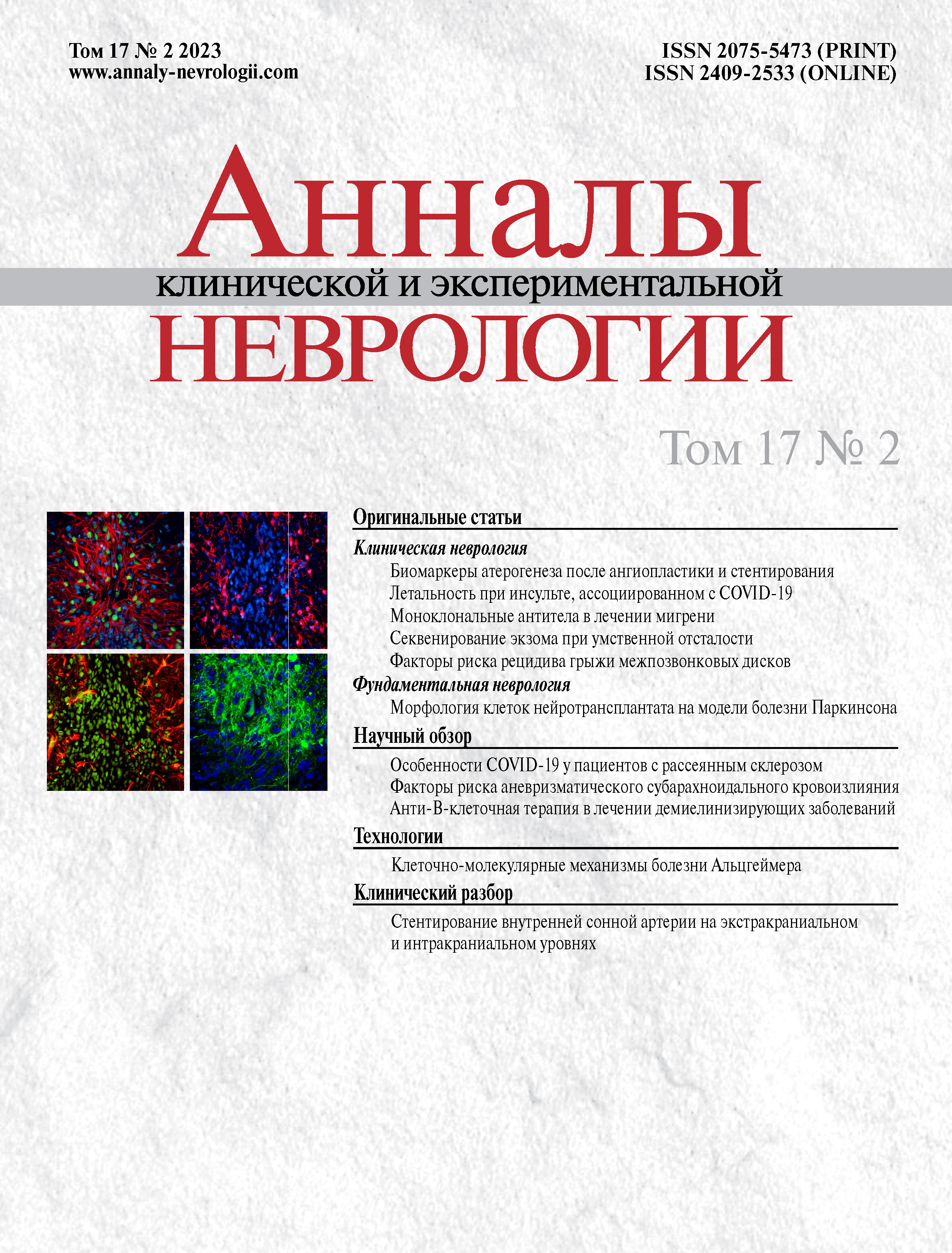 Materials and methods. We evaluated 50 individuals (50% men, 50% women; average age 65.4 ± 6.4 years) with established cerebrovascular disease associated with brain atherosclerosis. All of them had hemodynamically significant abnormalities in the internal carotid artery (ICA) with both symptomatic (stenosis 60% and more) and asymptomatic (stenosis 70% and more) stenoses confirmed by duplex scanning of the brachiocephalic arteries. All patients underwent CAS as indicated. Before and 1 year after the intervention, we performed clinical and neurological examinations, brain magnetic resonance imaging, and laboratory tests of atherogenesis biomarkers.