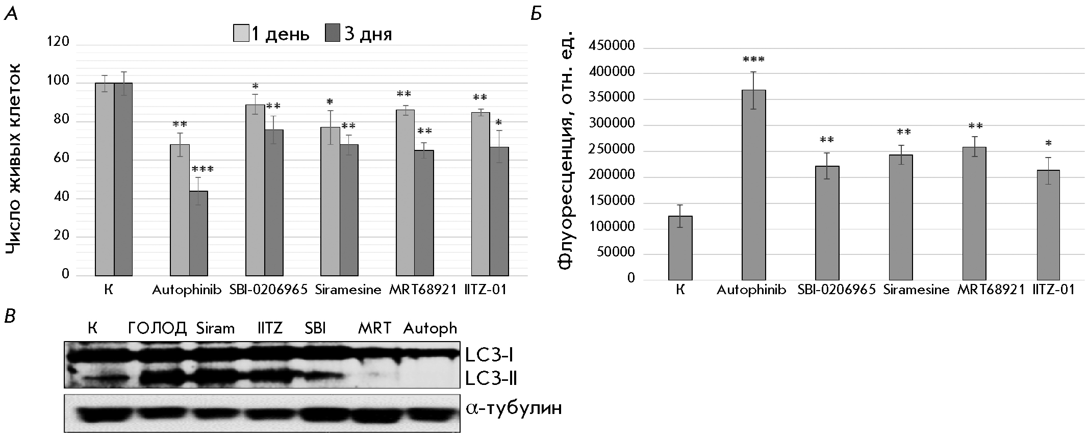 Fig. 1. The effect of autophagy inhibitors on A549 cancer cell survival. (A) – Flow cytometry analysis of the number of living cells after treatment with Autophinib, SBI-0206965, Siramesine, MRT68921, and IITZ-01. Results are obtained after DAPI staining of the cell population. The cells were counted on days 1 and 3 of treatment with the indicated agents (n = 10,000 events). Error bars correspond to mean ± SEM (n = 3), * p < 0.05, ** p < 0.05, *** p < 0.005. (B) – In vitro caspase-3 assay in the control A549 cells and A549 cells treated with Autophinib, SBI-0206965, Siramesine, MRT68921, and IITZ-01 after 1 day. Error bars correspond to mean ± SEM (n = 3), * p < 0.05, ** p < 0.05, *** p < 0.005. (C) – Immunoblotting of cell lysates obtained from the control A549 cells and A549 cells under conditions of serum starvation for 4 h. The A549 cells were treated with Autophinib, SBI-0206965, Siramesine, MRT68921, and IITZ-01 for 4 h under conditions of serum starvation. The Anti-LC3-I/II and -α-tubulin antibodies were used
