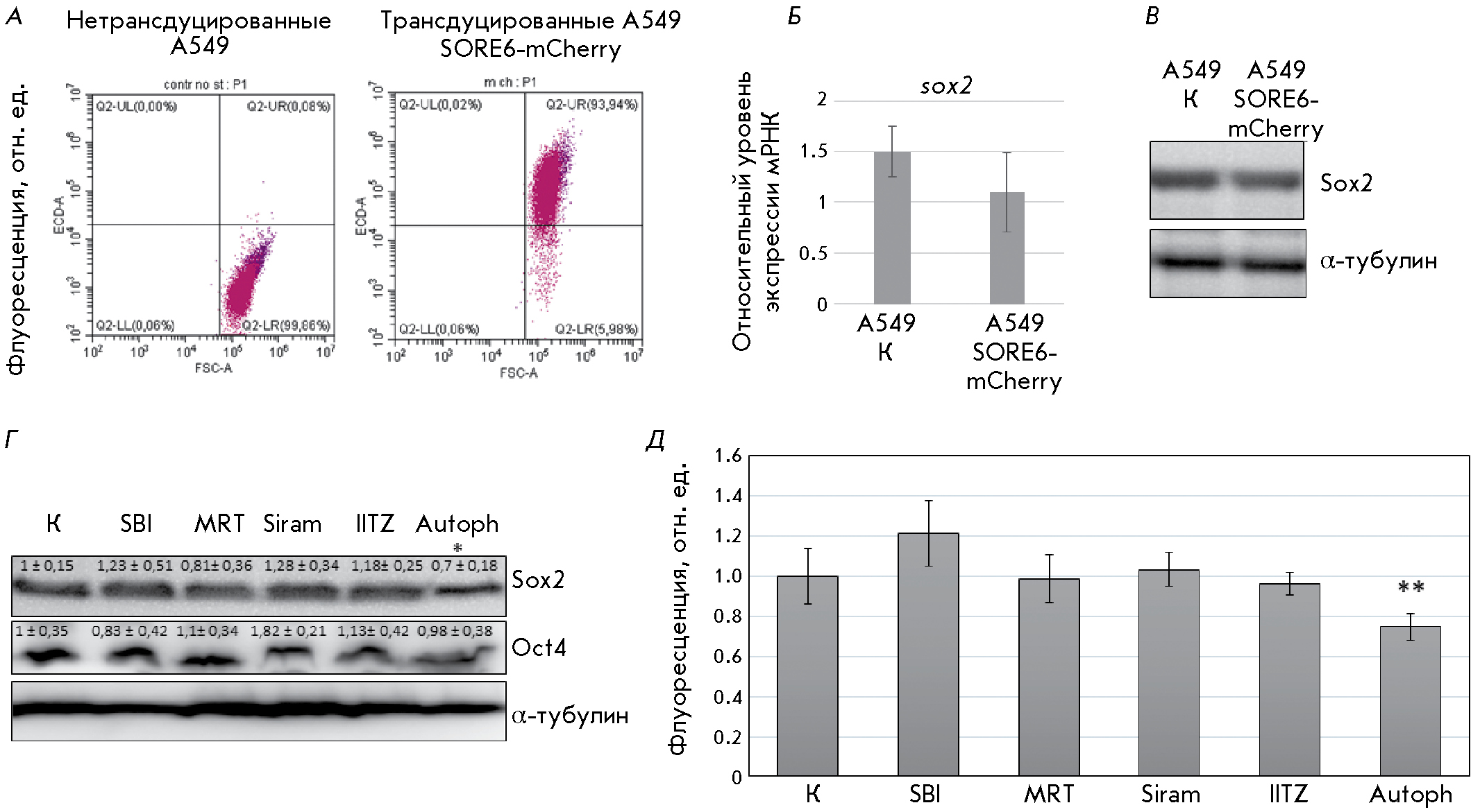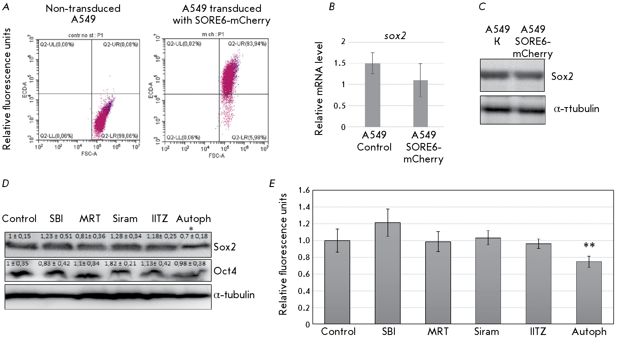 Lentiviral vector carrying the SORE6-mCherry reporter was kindly provided by Gordeev S.A. (Institute of Cytology of the Russian Academy of Sciences). A549 cells were transduced with the lentiviral vector using the protocol described in [12]. The fluorescence of mCherry was detected using a Becton Dickinson FACscan flow cytometer (USA) in the ECD-A channel.