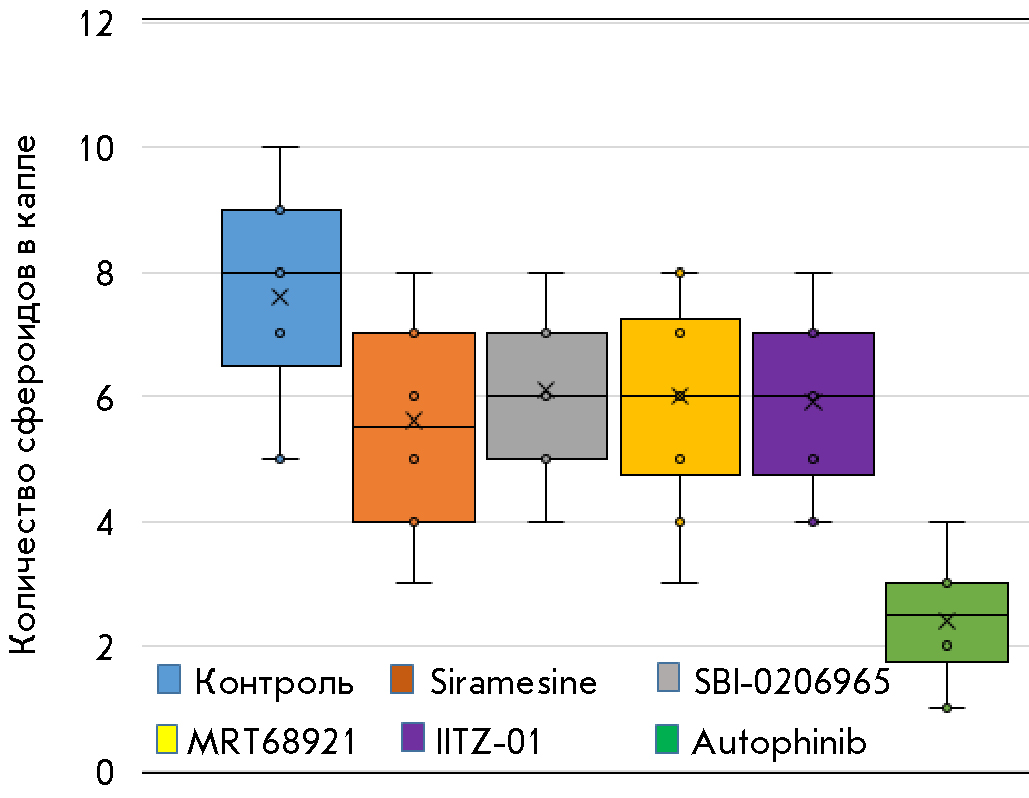 Fig. 3. Effect of autophagy inhibitors on the ability of A549 cells to form spheroids. The results are presented as box plots. Spheres with a size of at least 50 μm were counted in one drop