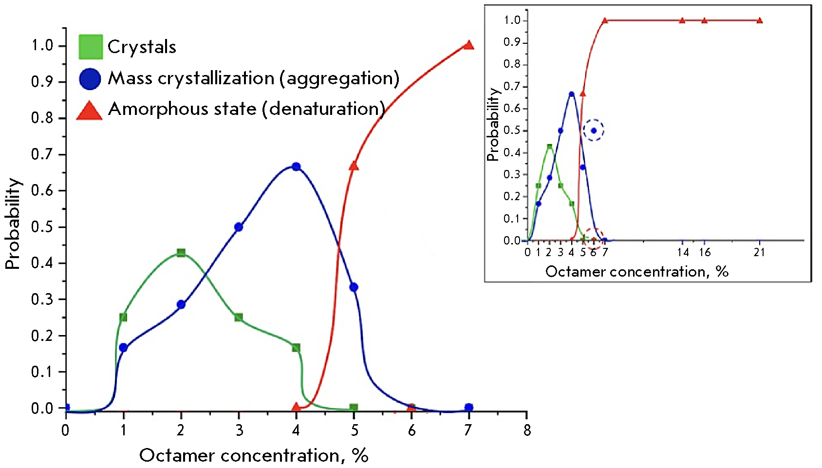 In the section “The effect of the precipitant concentration on the supersaturation degree and its dependence on the octamer concentration”, where we compared octamer concentrations at different NaCl concentrations, the supersaturation degree, and solubility, we stated that an increase in the NaCl concentration (from 15 to 30 mg/ml) results in an increase in the proportion of octamer fractions in the solution ranging from 2.9 to 4.1%. Measurements of supersaturation at different NaCl concentrations demonstrated that, in the region of octamer concentration of > 4%, the probability of monocrystal formation should decrease, while the probability of aggregation and amorphous state formation should increase. This pattern is observed in Fig. 3: the probability of crystal growth decreased to 0, while the probability of aggregation and denaturation began to increase at an octamer concentration of > 4%.