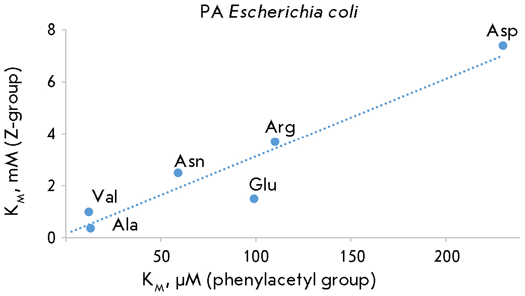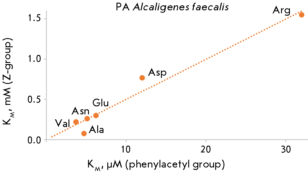 The difference in acyl groups per oxygen atom significantly alters the efficiency of substrate binding in the active center of penicillin acylases, which is characteristic of both Alcaligenes faecalis penicillin acylase and Escherichia coli penicillin acylase. However, the change in the structure of the N-acyl group does not affect the enzymes’ specificity toward the amino acid side chain radical as evidenced by the correlations between the Michaelis constants for the reactions of removal of the N-phenylacetyl and N-benzyloxycarbonyl protecting groups catalyzed by both penicillin acylases. Meanwhile, both enzymes differ in their specificities towards this structural fragment, as shown in Figs. 2 and 3, where the least effective binding substrates for penicillin acylase from Escherichia coli are derivatives of aspartic acid, while for penicillin acylase from Alcaligenes faecalis they are arginine derivatives.