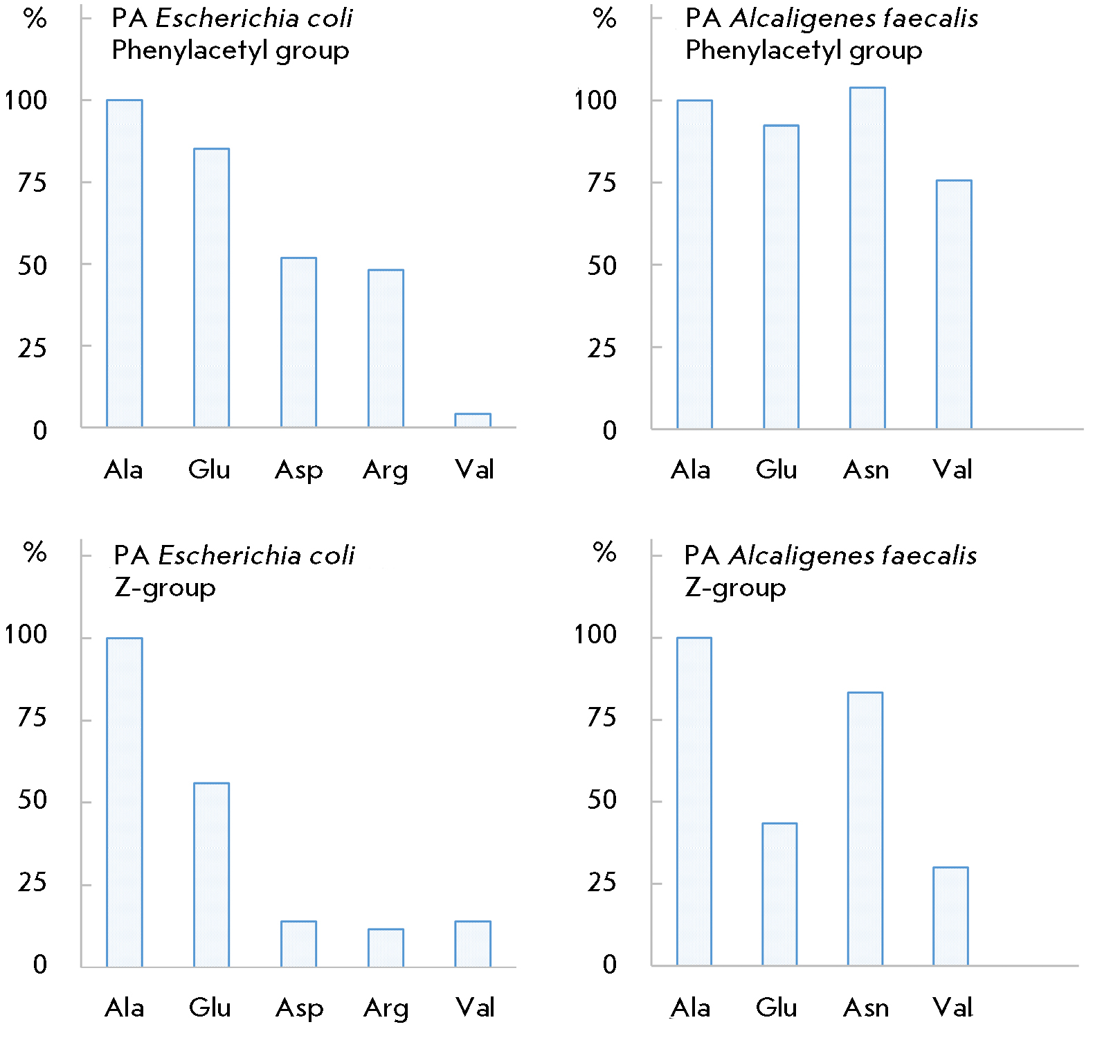 Fig. 4. The catalytic activity of penicillin acylases from Eschericha coli (left-hand side figures) and Alcaligenes faecalis (right-hand side figures) in the hydrolysis of the N-phenylacetyl and N-benzyloxycarbonyl (Z) amino acid derivatives expressed as the catalytic constant value (%) with respect to the corresponding alanine derivatives: the upper and lower graphs demonstrate the activity of the penicillin acylases with respect to the N-phenylacetyl and N-benzyloxycarbonyl derivatives of amino acids, respectively