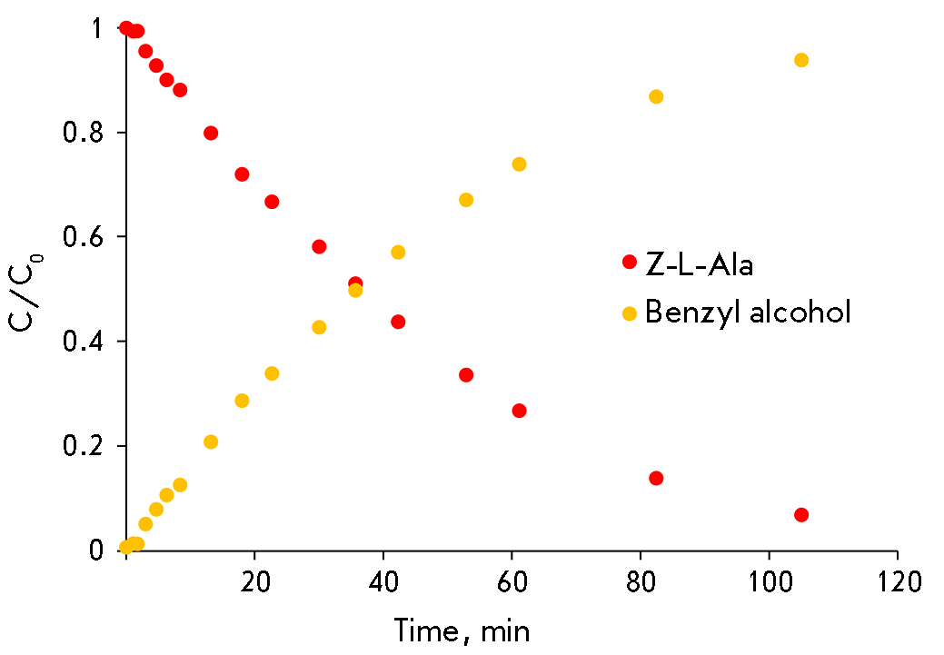 Fig. 5. Removal of the N-benzyloxycarbonyl protecting group catalyzed by penicillin acylase from Alcaligenes faecalis. The red dots show the changes in the concentration of the substrate (N-benzyloxycarbonyl-L-Ala); the yellow ones indicate the accumulation of the reaction product (benzyl alcohol). Reaction conditions: pH 7.5; 25°C; substrate concentration, 1 mM; enzyme concentration, 6 μM