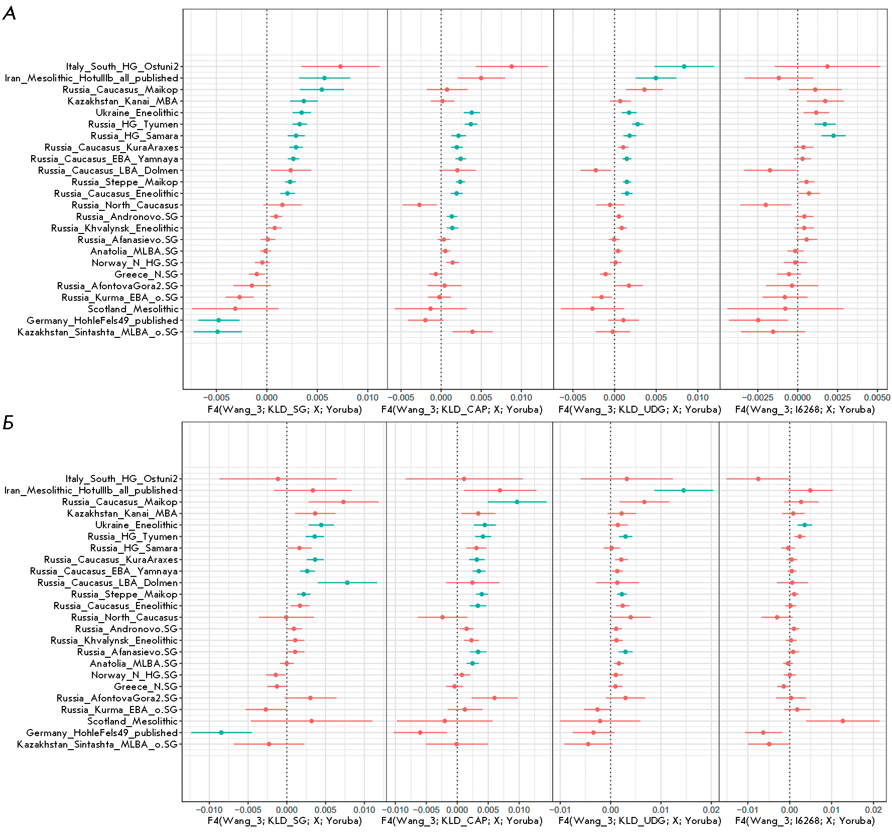 To study the role of sample preparation in population analysis data interpretation, we calculated the F4 statistics in the F4(Wang_3, Y;X, Yoruba) configuration. The Wang_3 population consists of three samples (I6267, I6266, and I6272) of the Novosvobodnaya cultural variant, to which sample I6268 belongs. Population X was used from a list proposed by archaeologists (provided on the left of the Y axis in Fig. 5) based on their historical hypotheses. The Yoruba population was used as the outgroup. Four SNP sets determined for KLD_SG, KLD_CAP, KLD_UDG, and I6268 were used as Y populations. As stated above, the intuitive meaning of non-zero significant statistics will indicate which population from the X list contributes the most both to the Wang_3 population in case of positive statistics and the experimental sample Y in case of negative statistics. Interpretation of the archaeological and historical meaning of the difference between population Wang_3 and the sample used for the preparation of the four test libraries is beyond the scope of this paper. Calculations were presented only as an example to demonstrate that reliable non-zero F4 statistics can be interpreted differently depending on the method of sample preparation.