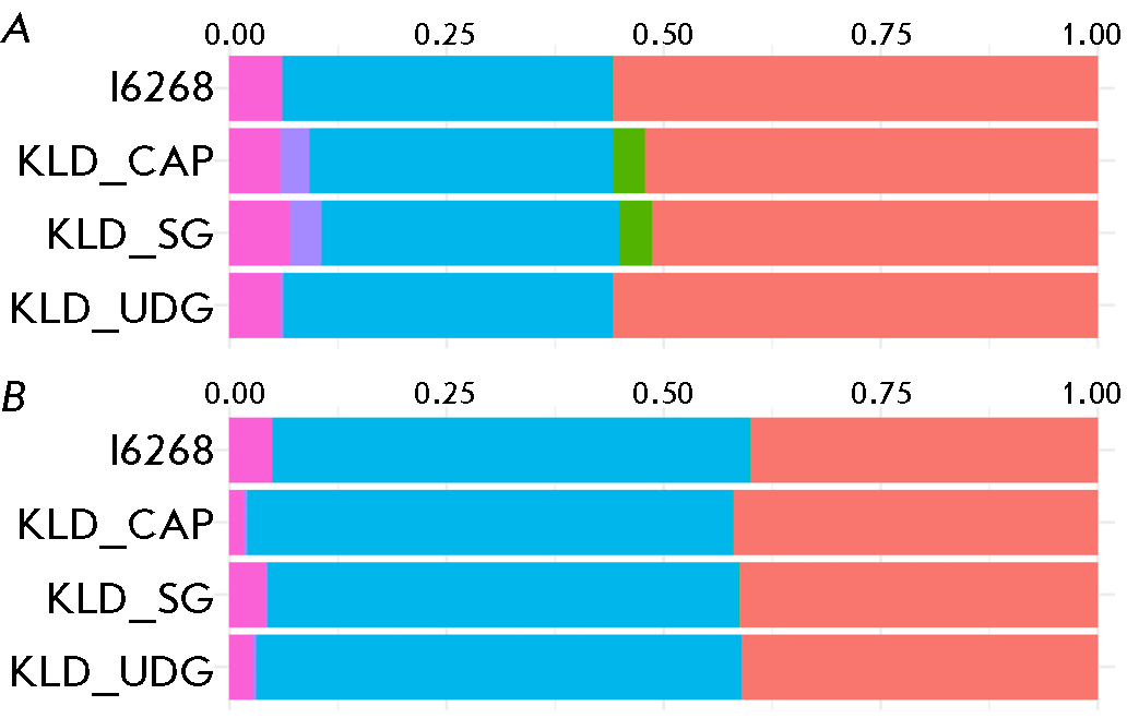 The results of the ADMIXTURE analysis for K = 7 for three libraries prepared in this study with the previously sequenced Novosvobodnaya cultural variant sample I6268 [22], to which the Klady burials belong, demonstrated additional components in non-UDG-treated samples (samples KLD_CAP and KLD_SG; green and purple components in Fig. 2A). Based on the identity of the bone sample, the false effect of postmortem aDNA modifications on the ADMIXTURE analysis results when preparing libraries without using UDG was hypothesized.
