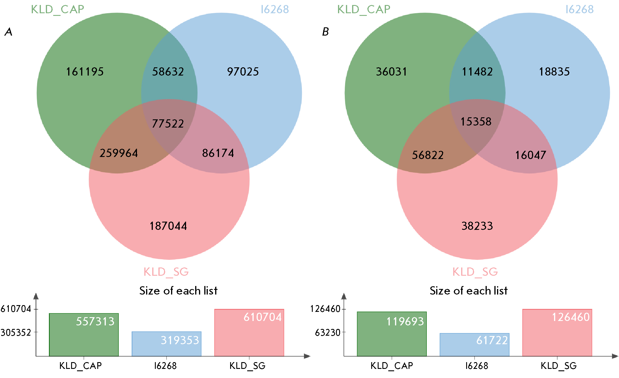 Fig. 3. Venn diagrams for the SNPs of the three libraries (KLD_CAP, KLD_SG, and I6268). The total number of SNPs for each library is shown below the charts. (A) – Transversions and transitions; (B) – Transversions only