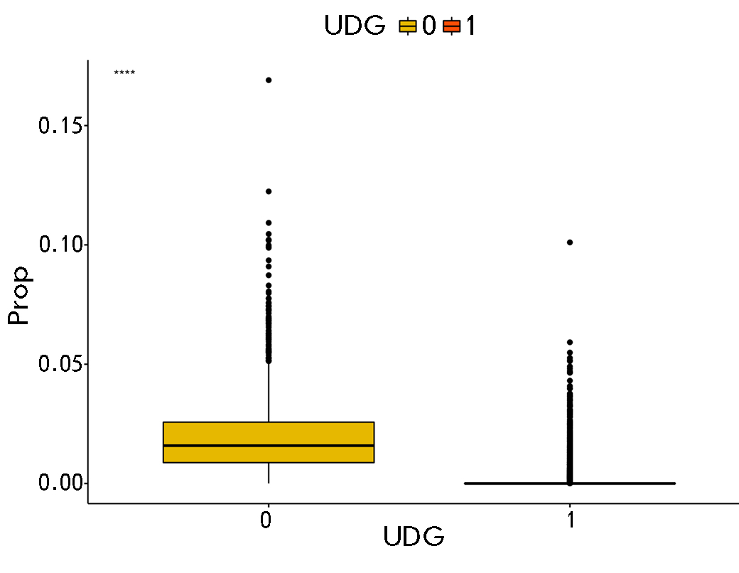 Fig. 4. Distribution of the relative content of additional components in the ADMIXTURE analysis between samples from the Allen Ancient DNA Resource V44.3 panel treated with UDG (1) - 2,376 samples and without treatment (0) - 908 samples. Prop – the proportion of admixtures