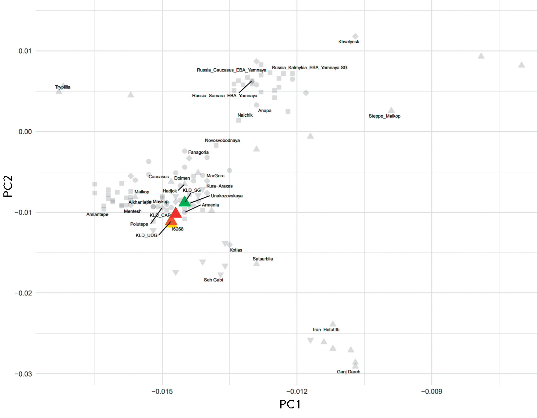 Fig. 6. Principal component analysis (PCA). Ancient samples were projected onto the vectors of modern samples that were used only to construct PCA and are not shown in this figure