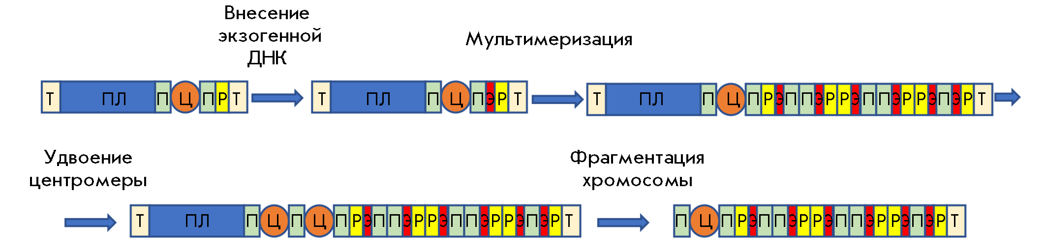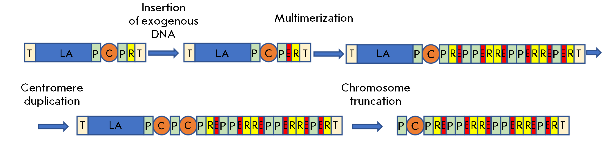 Fig. 2. Diagram of generation of a satellite DNA-based artificial chromosome (SATAC). Exogenous DNA bearing site-specific recombination sites, a selective marker, and other sequences is inserted into the pericentromeric region of an acrocentric chromosome using homologous recombination. This insertion results in the amplification of pericentromeric, ribosomal, and exogenous DNA regions. Centromere duplication is followed by chromosome truncation, which leads to HAC formation. Symbols: T – telomere; LA – long arm of the acrocentric chromosome; P – pericentromeric region; C – centromere; R – ribosomal DNA; E – exogenous DNA