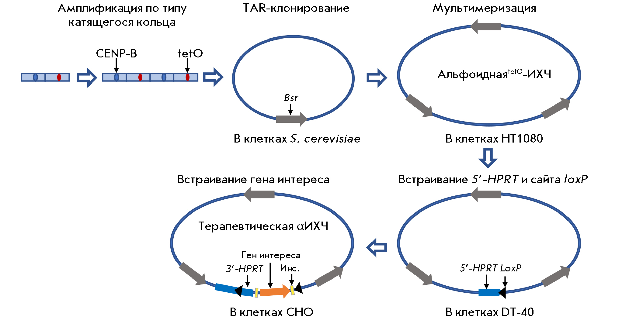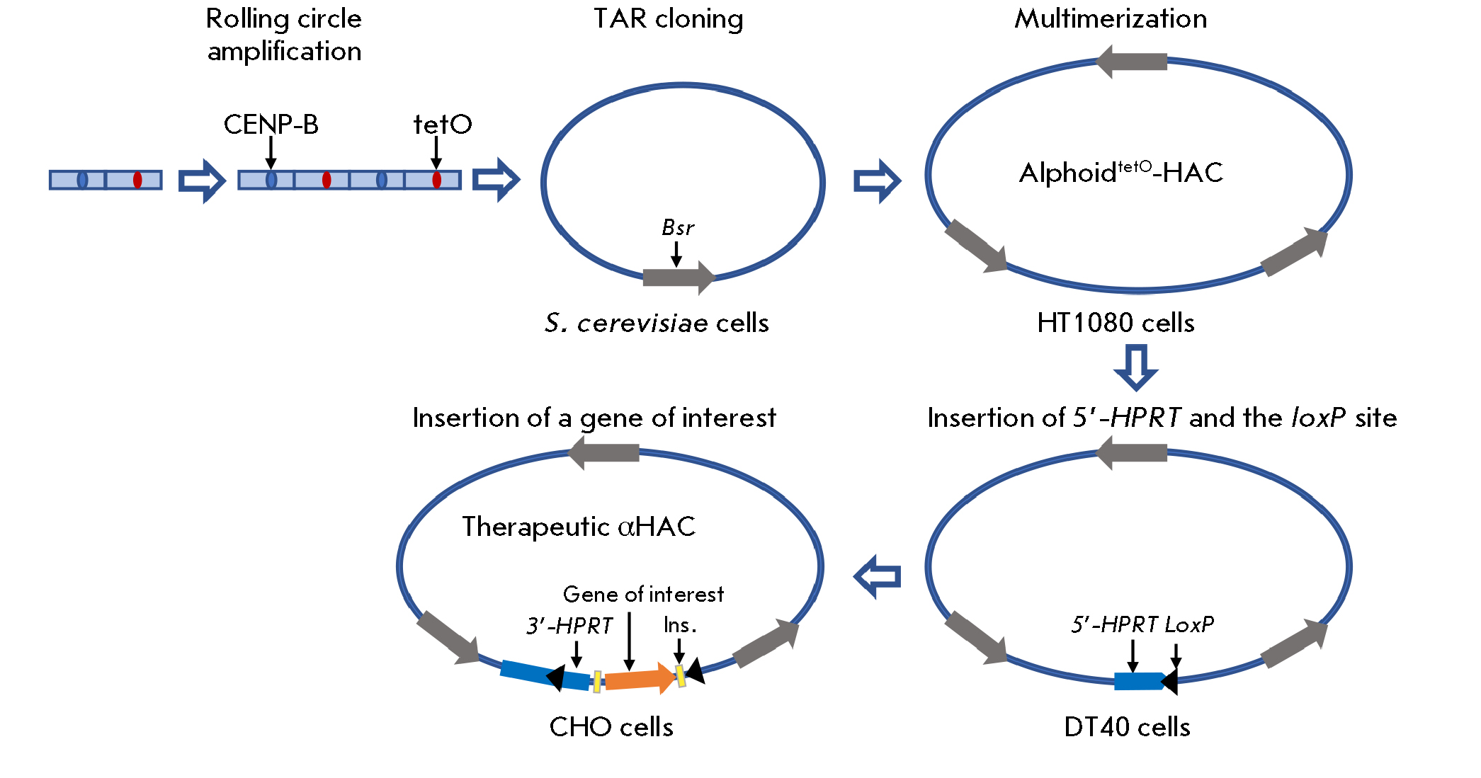 Fig. 3. Representation of alphoidtetO-HAC assembly. At the first step, a tandem array comprising two units is synthesized: one unit is a 170-bp CENP-B-box-containing (blue oval) alphoid repeat from the human chromosome 17 centromere, and the second unit contains the same repeat in which the CENP-B-box is replaced with the tetracycline operator (tetO, red oval). Rolling circle amplification of the array produces a 10-kbp fragment. These fragments are cloned by TAR cloning in yeast cells, which provides a 50-kbp circular construct containing the blasticidin resistance gene (Bsr, gray arrow). The circular construct is multimerized in HT1080 cells, which results in the formation of a 1.1-Mbp alphoidtetO-HAC. Fusion of HT1080 cells with DT40 cells (black arrow) is accompanied by the insertion of the loxP site into the HAC. The alphoidtetO-HAC is transferred to CHO cells, where the construct is loaded with a gene of interest (orange arrow), together with the flanking insulator sequences (yellow boxes) and a 3’ fragment of the HPRT gene (blue line). The alphoidtetO-HAC is transferred to target cells using MMCT