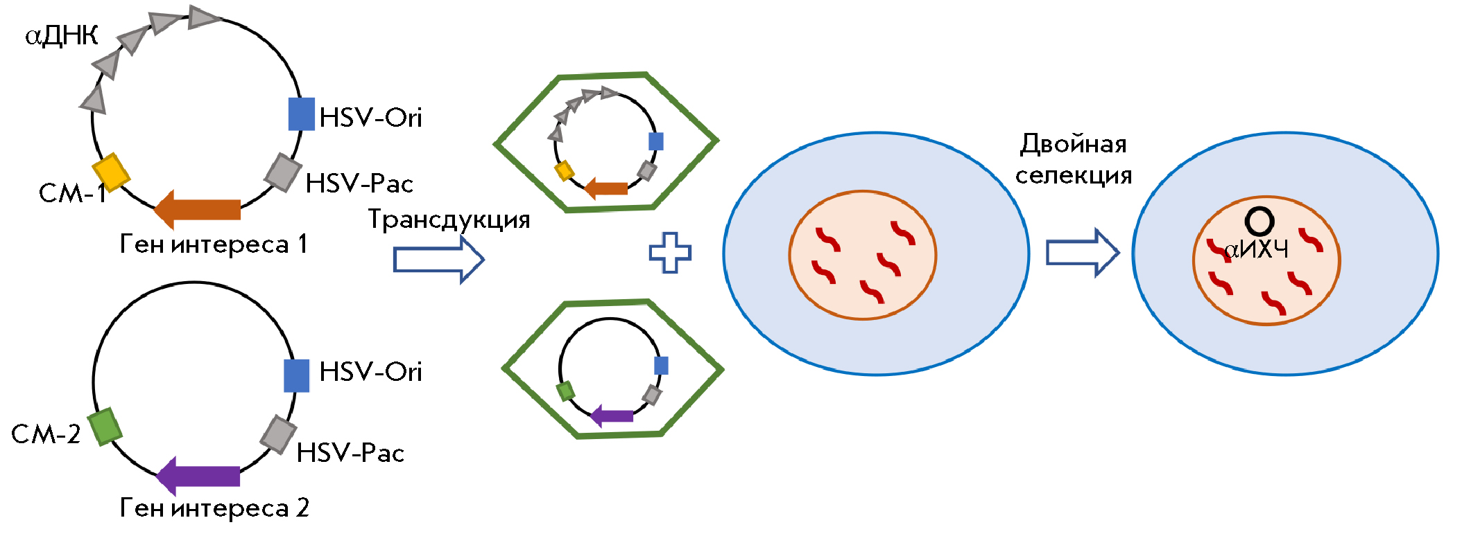To assemble a HAC, human chromosome 17 and 21 centromeric sequences, a target gene, and selective markers were introduced into a BAC-containing OriS and Pac signals [68]. This vector and two auxiliary plasmids were transferred to green monkey cells, which ensured production of the vector and its packaging into the viral capsid that was then transduced into human cells (Fig. 5). The produced genetic construct was shown to act as a HAC, being maintained during cell division and providing stable transgene expression. Also, mitotic stability of the HAC was found to be mediated by an alpha-satellite sequence in a 40-kbp vector. Given that the maximum capacity of HSV-1-based vectors is 152 kbp, and that the centromeric region length is approximately 42 kbp, a target transgene of up to 110 kbp in length can be inserted into the considered HAC. An important indication that the HSV-1 replicon-based HAC may be used in cell therapy in the future was its successful transfer to human ESCs [72] and iPSCs [73].