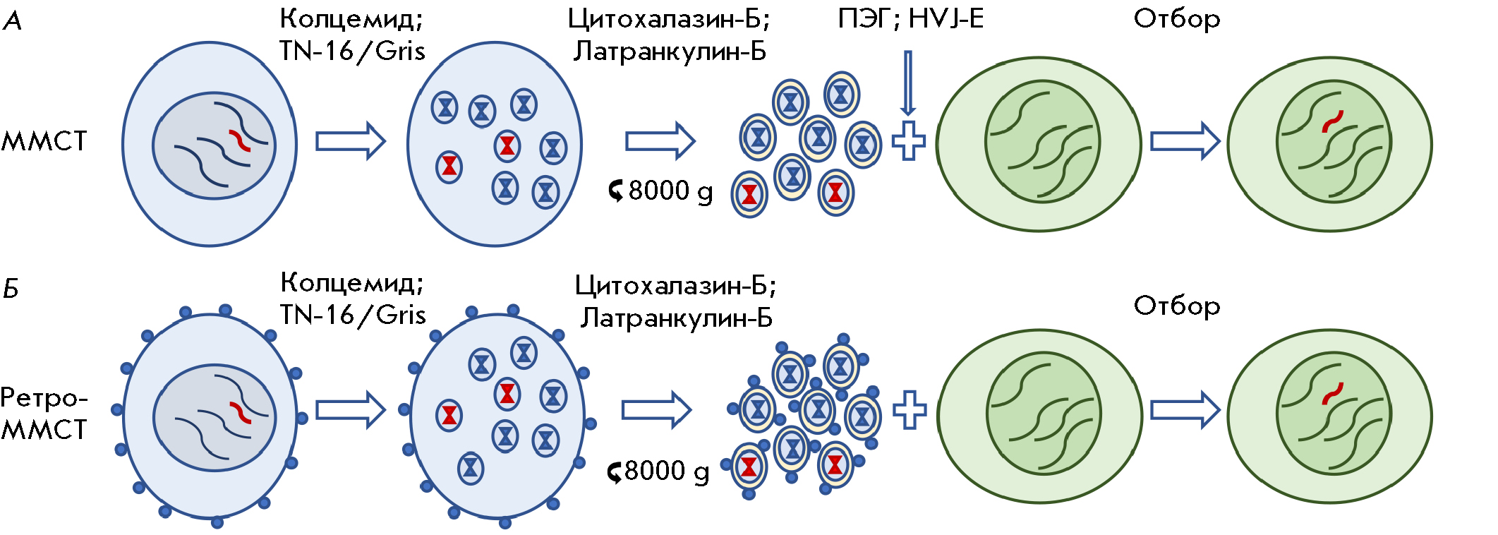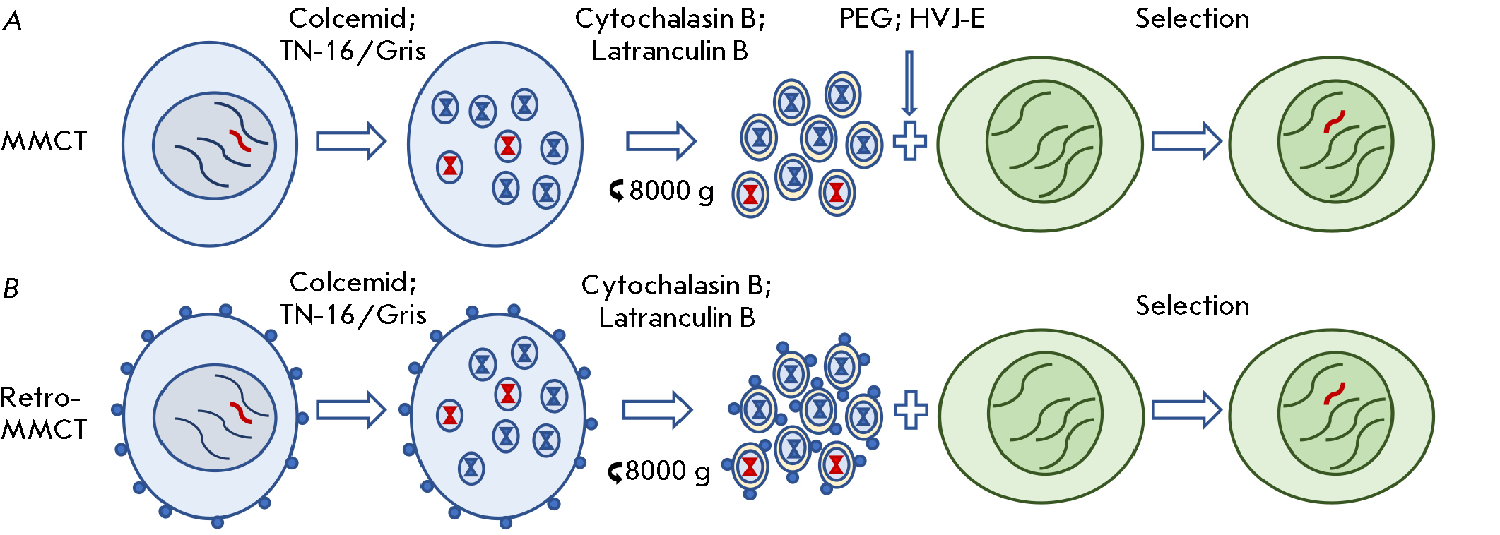 The main method used to transfer HACs and other vectors of 1 Mbp or more in length is microcell-mediated chromosome transfer (MMCT), which enables the transfer of these vectors from donor cells to target cells using the so-called microcells (Fig. 6A) [74]. In donor cells, the formation of micronuclei, which are individual chromosomes surrounded by a nuclear envelope, is initiated. For this purpose, donor cells are incubated with cytostatic agents, colcemid [75] or griseofulvin, and TN-16 [76, 77], which cause cell cycle arrest at the metaphase stage. A9 (mouse subcutaneous tissue) or CHO cells are used as donor cells [8]. Donor cells are then fragmented into microcells by treatment with actin filament assembly inhibitors (cytochalasin B [75] or latrunculin B [76, 77]), followed by prolonged centrifugation. The microcell fraction is isolated using filtration [75] or a percoll gradient [60]. Microcells are then fused with target cells using polyethylene glycol (PEG) [75] or the hemagglutinating virus of the Japan envelope (HVJ-E) [23, 56, 57]. A retro-MMCT method (Fig. 6B) based on the use of the murine leukemia virus (MLV) envelope protein demonstrated improved efficiency compared with that of the original method. The MLV protein on the surface of microcells mediates their binding to the plasma membrane protein present on the surface of almost all types of mammalian cells, thus increasing the efficiency of cell–microcell fusion [78]. Using this MMCT variant, the alphoidtetO-HAC was successfully transferred to human iPSCs [58]. It is important to note that various modifications of MMCT can be combined at its different stages, thereby increasing the efficiency of HAC transfer [12, 56, 58, 77, 78]. Cells bearing a target HAC are selected by culturing in the presence of antibiotics (blasticidin, G418, etc.) resistance to which is provided by the HAC.