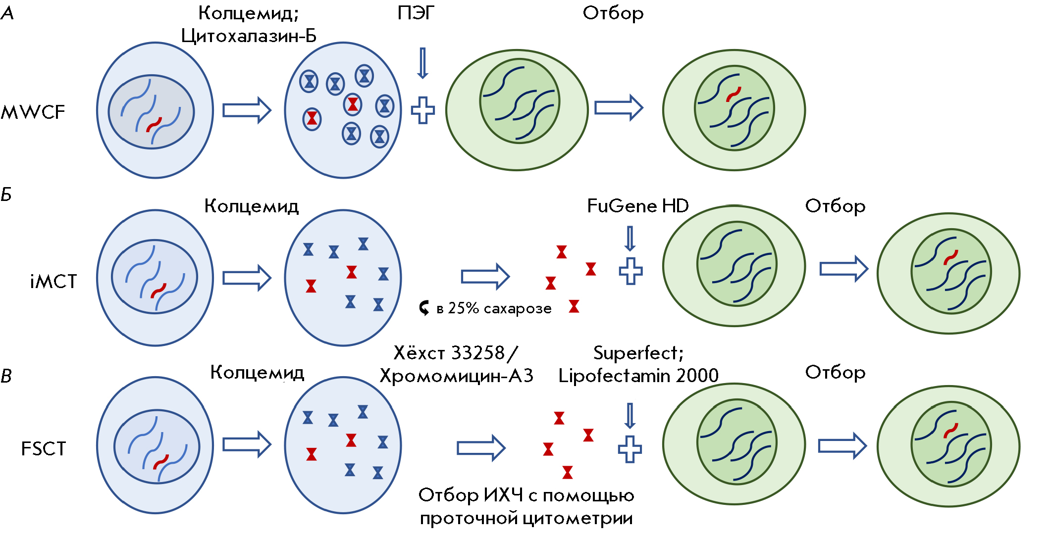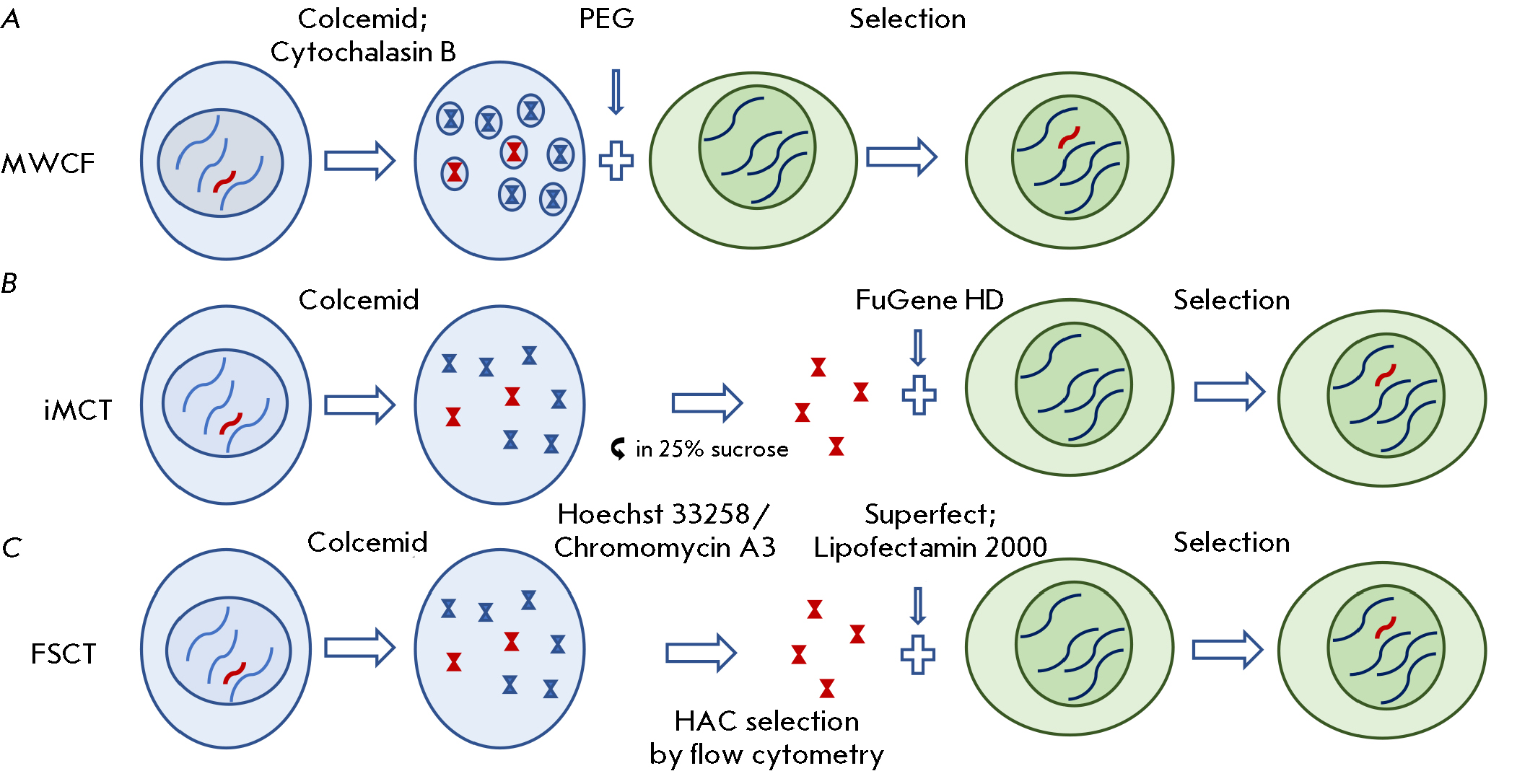Fig. 7. Methods of HAC transfer that do not use microcells. (A) MWCF – fusion of donor cells with recipient cells. (B) iMCT – transfection of isolated chromosomes into target cells using lipofection. Colcemid-pretreated donor cells are lysed, and HACs isolated on a sucrose gradient are transferred to recipient cells using the FuGene HD reagent. (C) In FSCT, HACs are stained with Hoechst 33258 and chromomycin A3, collected by flow cytometry, and transfected into target cells using lipofection