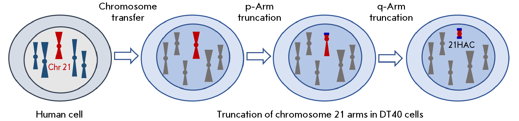 Fig. 1. Schematic representation of 21HAC assembly using telomere-associated chromosome truncation. Human chromosome 21 was transferred to DT40 cells. Then, telomeric sequences (shown in blue) were inserted into the pericentromeric site using homologous recombination, which led to truncation of the chromosome. Thus, the 21HAC was generated using successive truncation of chromosome arms and their replacement with telomeric sequences