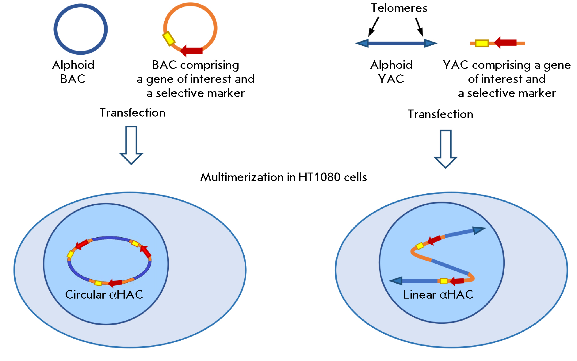 Human artificial chromosomes are vector constructs that possess the following crucial chromosomal characteristics: (1) the ability to self-maintain autonomously, i.e., as an additional chromosome, in the cell and (2) the ability to replicate and be transmitted to both daughter cells during cell division. Thus, the use of HACs skirts the risks of insertional mutagenesis and ensures a stable expression of transgenes. A unique feature of HACs is their ultra-high capacity that enables the transfer of transgenes up to several-million-base-pairs long, in particular entire gene loci with cis-regulatory elements, which ensures an accurate expression of endogenous loci. Although many structurally diverse HACs have been developed to date, these vector systems are still being intensively improved and modified [8–13]. Two approaches are used to produce HACs. The first is the so-called top-down approach that is based on the production of HACs from native chromosomes by their maximal truncation, leaving only the centromeric and telomeric regions that are necessary for their stable replication in the cell [14–16]. The second is the synthetic bottom-up approach that is used to produce linear or circular HACs through the synthesis and assembly of large regions of pericentromeric alpha-satellite DNA in vitro [13, 17–19]. It should be noted that, despite the obvious advantages of HACs over other vector systems, there is a number of technical limitations standing in the way of their extensive use both in scientific research and in biomedical applications. One of the main limitations of the system is the inefficiency and laboriousness of the methods used to transfer HAC into target cells. This review describes different HAC types, methods of delivery into cells, and prospects for the application of these ultra-high capacity episomal vectors in medical practice.