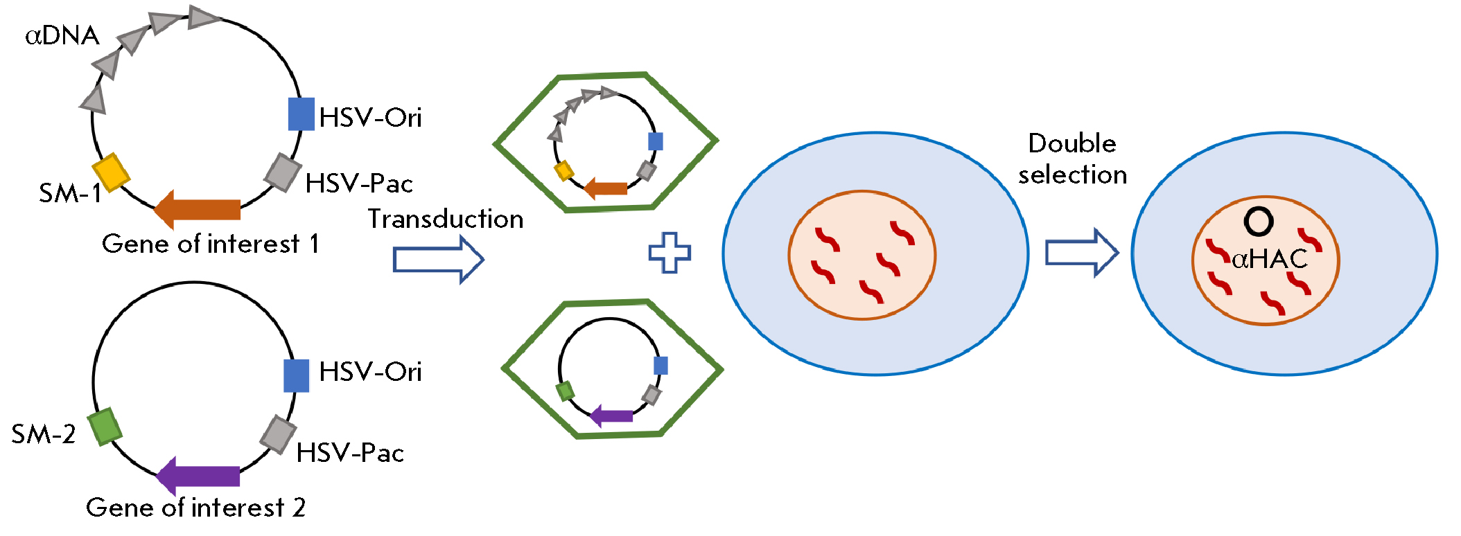 A unique method for a direct HAC assembly in mammalian cells with the use of a herpes simplex virus type 1 (HSV-1) amplicon-based vector has been proposed [68]. This vector contains the Pac signal, which is necessary for its assembly into the viral capsid, and the viral replication origin, OriS [69]. The transgene-containing vector and two additional genetic constructs were co-transfected into green monkey cells to produce the vector amounts necessary for the transfection and package of the vector into the viral capsid. These additional constructs were expression vectors, one of which contained most of the HSV-1 genes required to assemble the viral capsid and pack the viral DNA into it. The other vector contained the ICP27 gene required to regulate the expression of viral genes. Both accessory constructs lacked the Pac and OriS signals, which prevented them from replicating and packaging into the viral capsid. Viral amplicon vectors are able to accommodate a transgene of about 152 kbp in length [70, 71].
