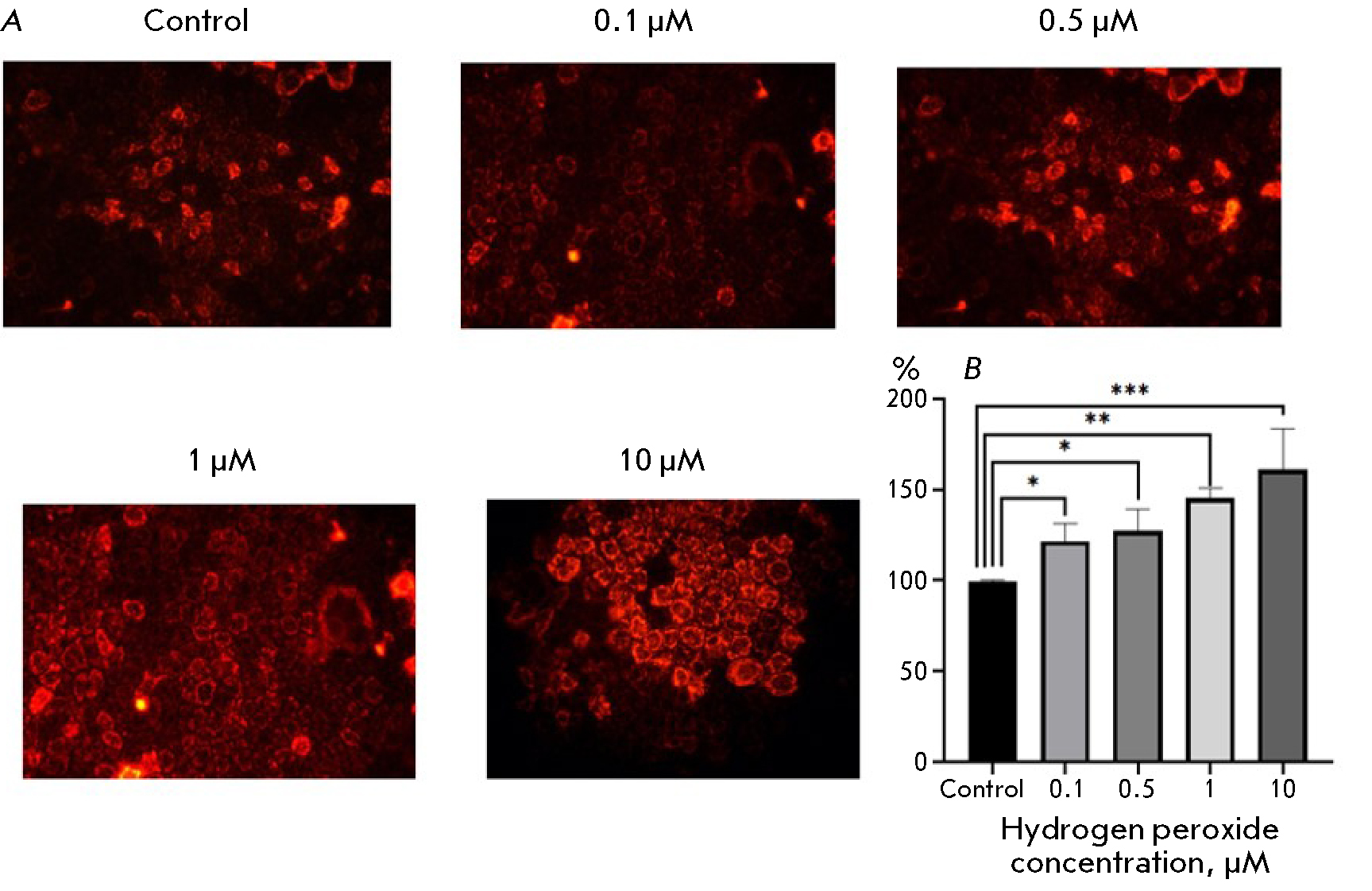 Fig. 1. Hydrogen peroxide (H2O2)-induced changes in the ROS level in Caco-2 cells. (A) Staining with MitoTracker Red CM-H2XRos; magnification: 400×. (B) Fluorescence intensity in a cell lysate. *p ≤ 0.05; **p < 0.01; ***p ≤ 0.001 compared with control (Dunnett’s test)