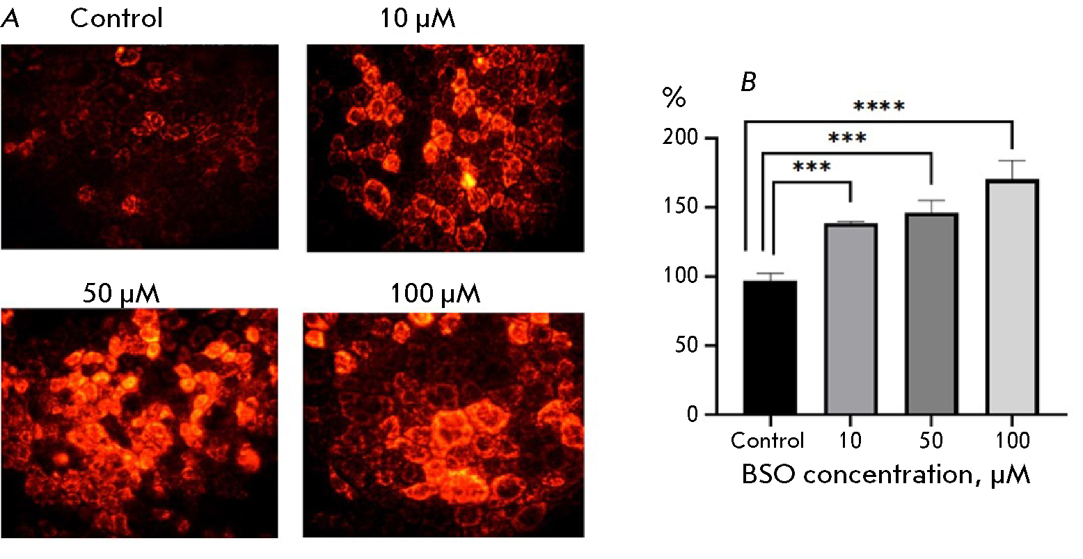 Fig. 2. D,L-buthionine sulfoximine-induced changes in the ROS level in Caco-2 cells. (A) Staining with MitoTracker Red CM-H2XRos; magnification: 400×. (B) Fluorescence intensity in a cell lysate. ***p ≤ 0.001; ****p ≤ 0.0001 compared with control (Dunnett’s test)