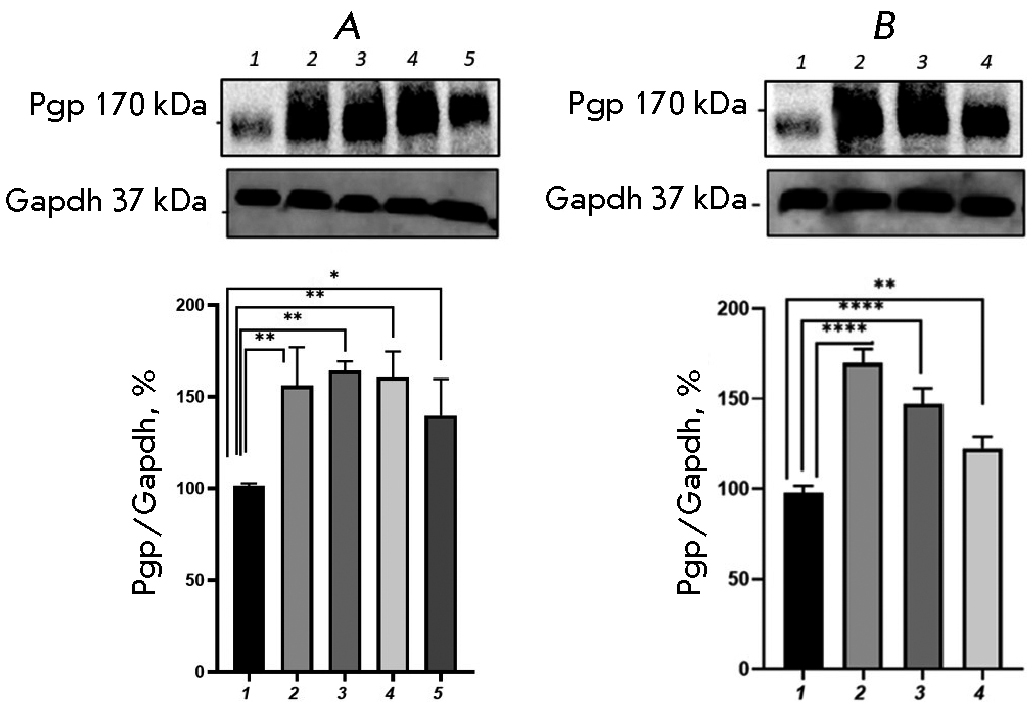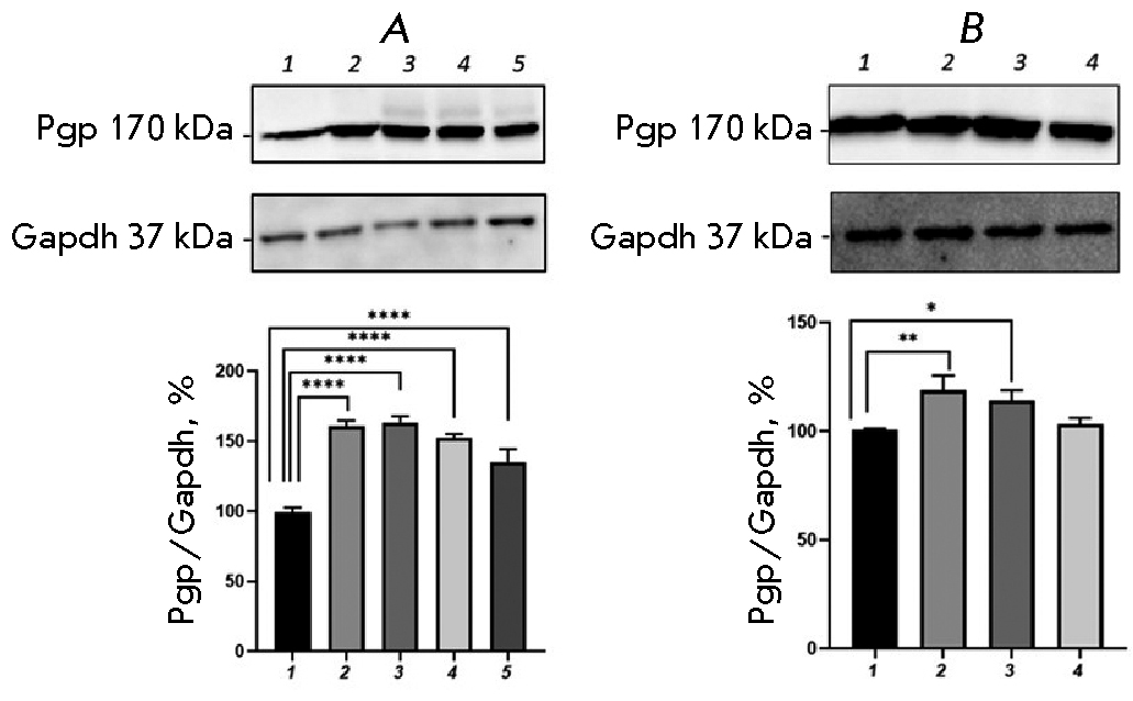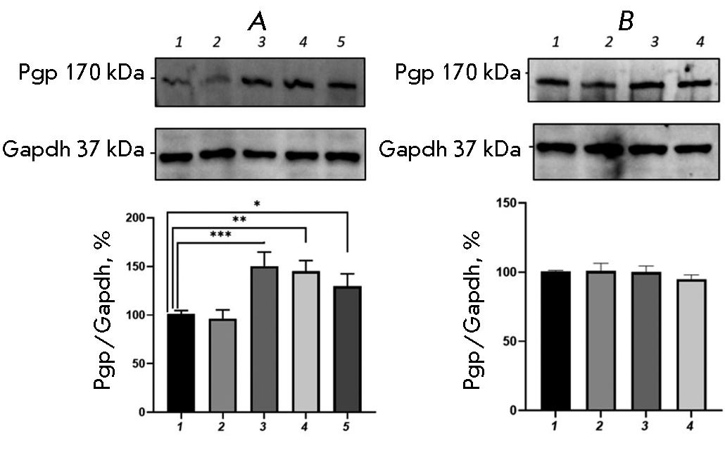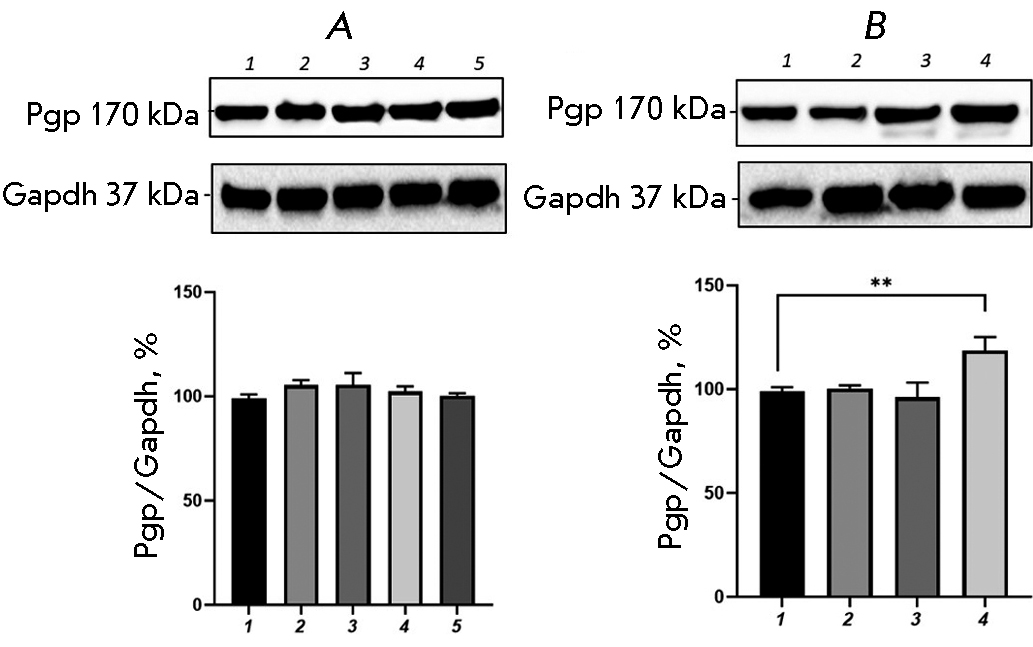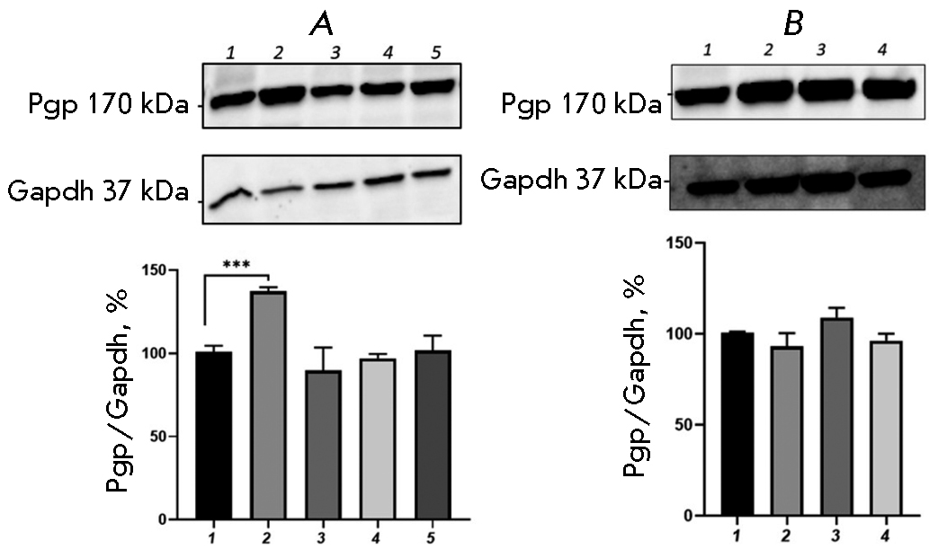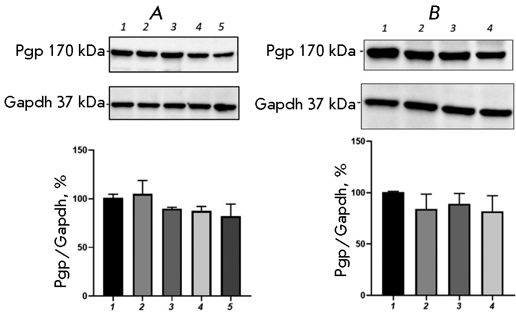 The combined use of BSO and CINPA1 prevented an increase in the relative P-gp content; the transporter protein level did not differ significantly from that in the control.